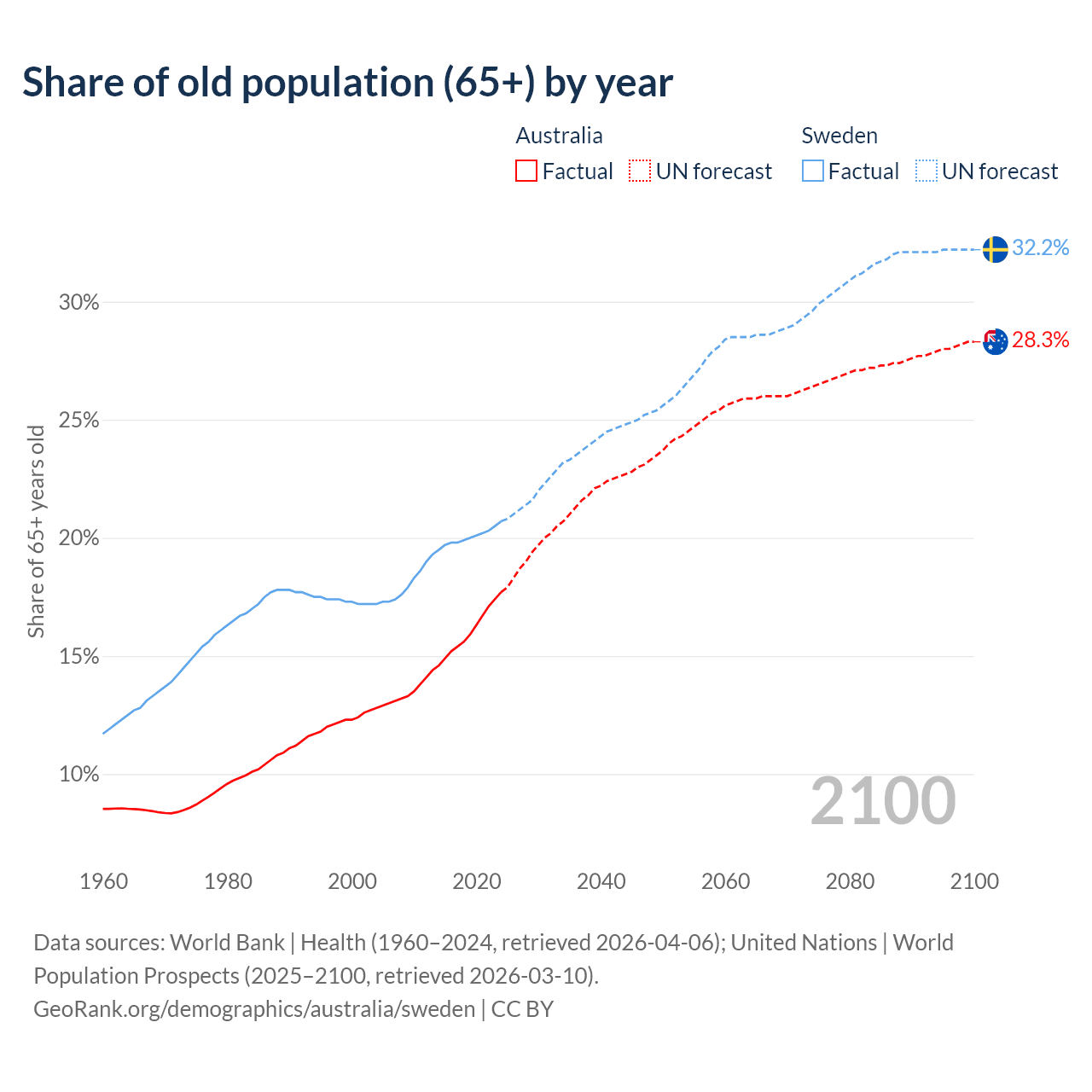 The share of older people aged 65 and over is 17.7% in Australia and 20.7% in Sweden. Life expectancy in Australia compared to Sweden .