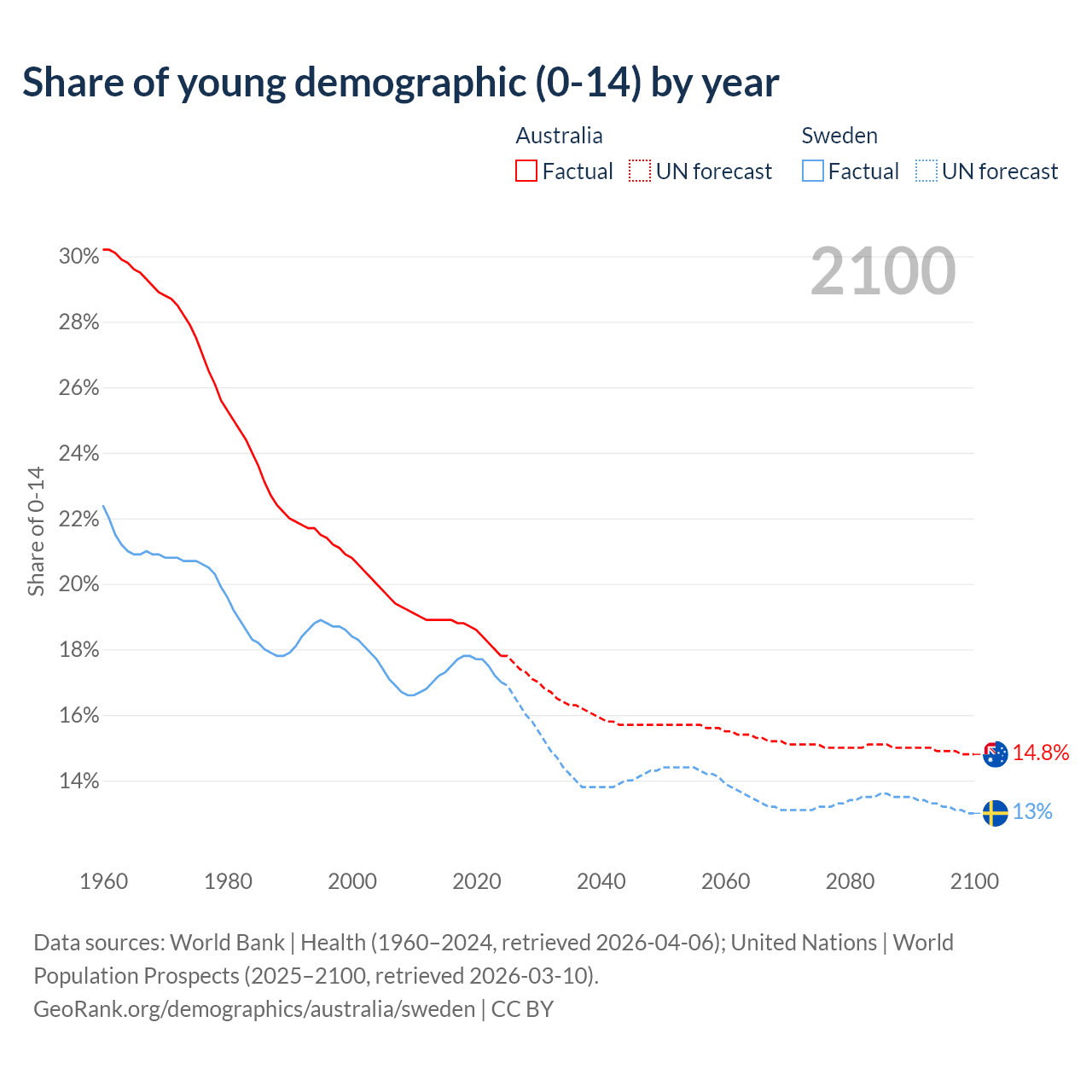 - The share of young demographic (0-15 years old) in Australia is 17.8% vs 17% in Sweden.
