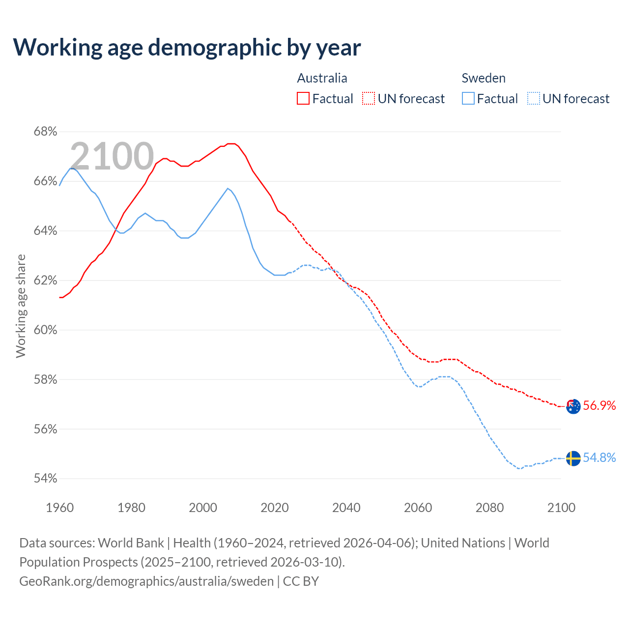 Median age Australia vs Sweden, 1960-2100