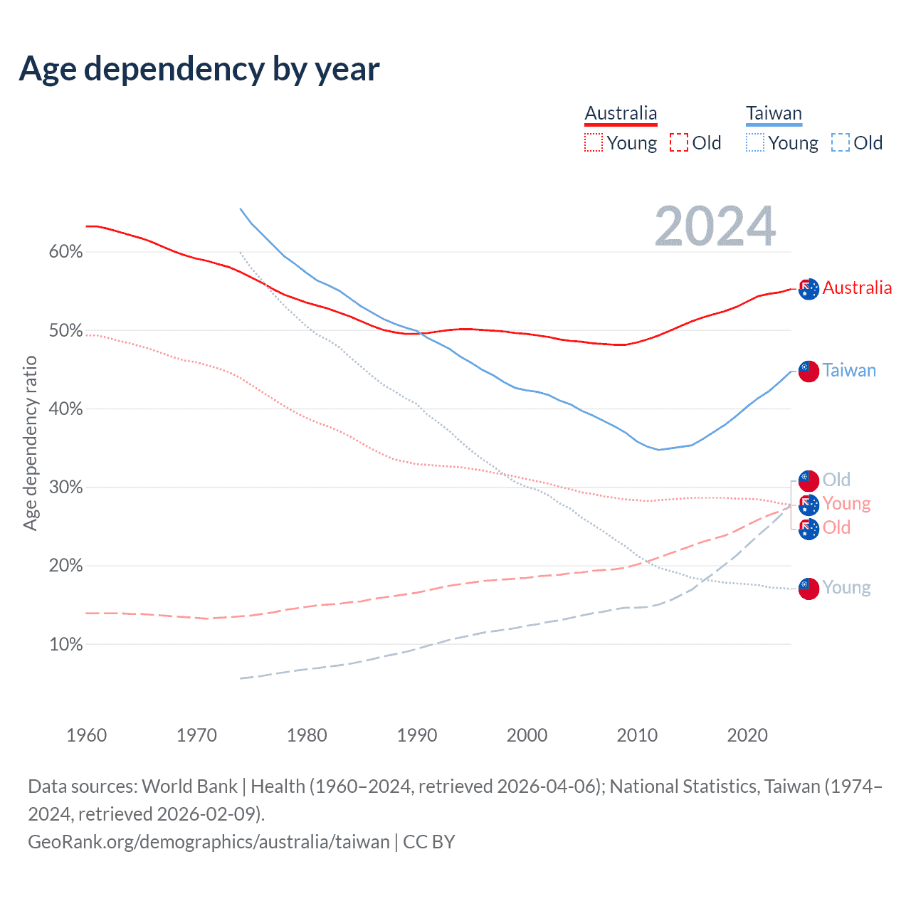 Data sources: World Bank | Health (1960–2024, retrieved 2026-04-06); U.S. Census Bureau (1960–2024, retrieved 2026-02-08); National Statistics, Taiwan (1974–2024, retrieved 2026-02-09).