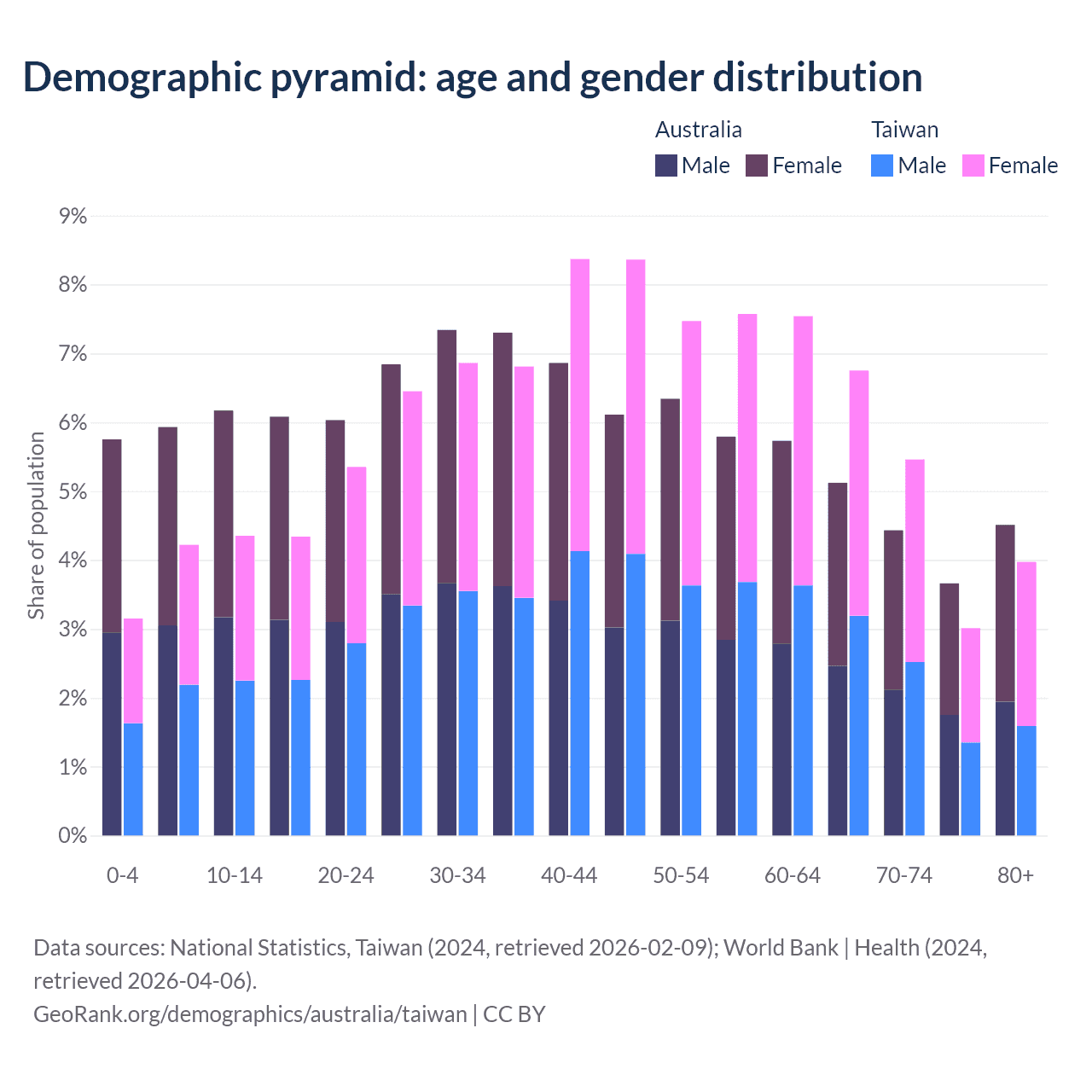 The share of older people aged 65 and over is 17.7% in Australia and 19.2% in Taiwan. Life expectancy in Australia compared to Taiwan .
