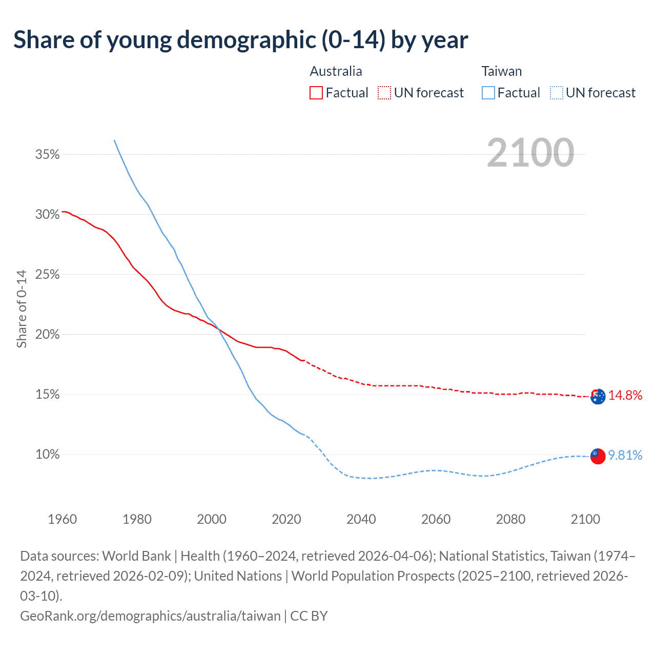 - The share of young demographic (0-15 years old) in Australia is 17.8% vs 11.7% in Taiwan.