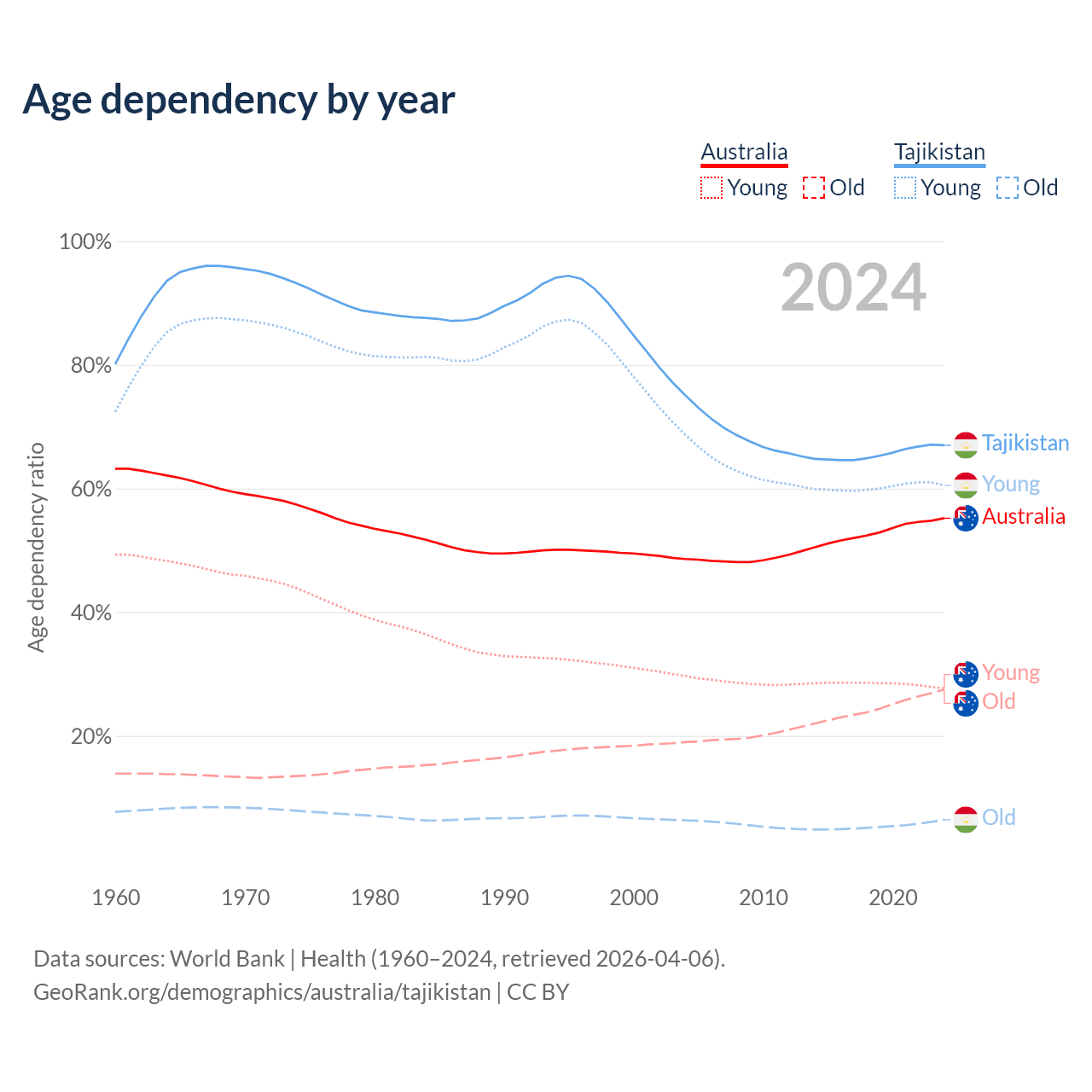 - The share of old-age demographic (65+) in Australia is 17.7% vs 3.85% in Tajikistan.