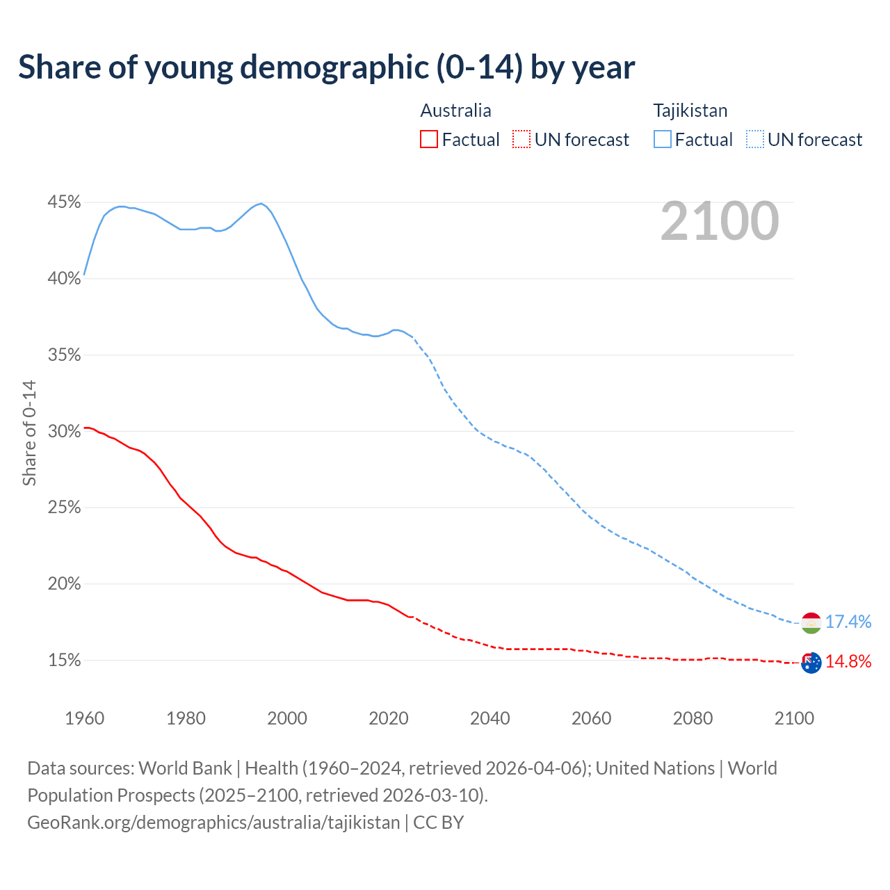 - The share of young demographic (0-15 years old) in Australia is 17.8% vs 36.3% in Tajikistan.