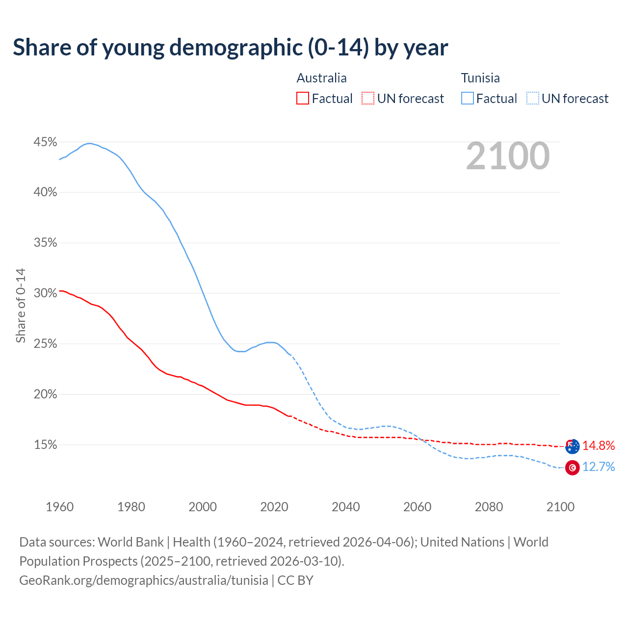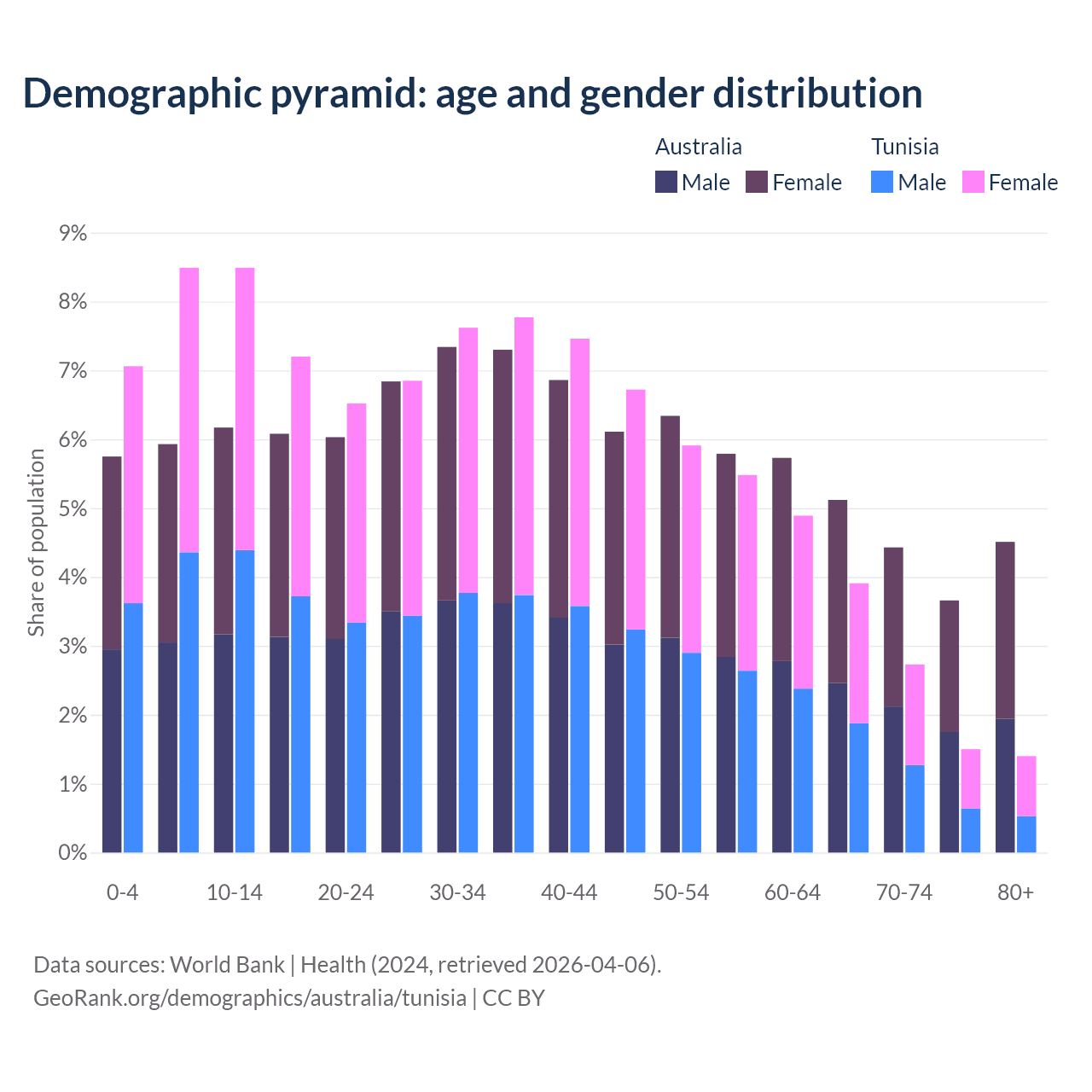 - Australia is ranked 55/196 by median age (oldest to youngest) vs 86/196 for Tunisia.