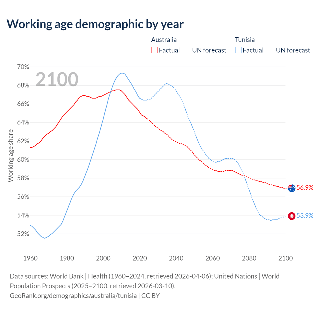 - Australia has 17.9M working age adults (aged 15-64) vs 8.26M in Tunisia.