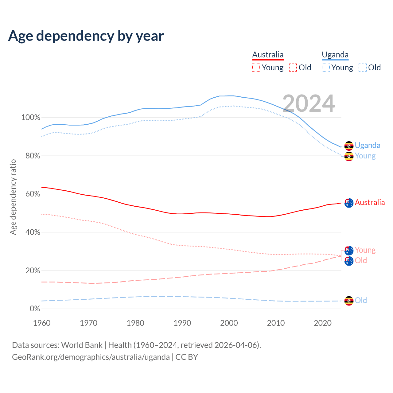 - The share of old-age demographic (65+) in Australia is 17.7% vs 2.19% in Uganda.
