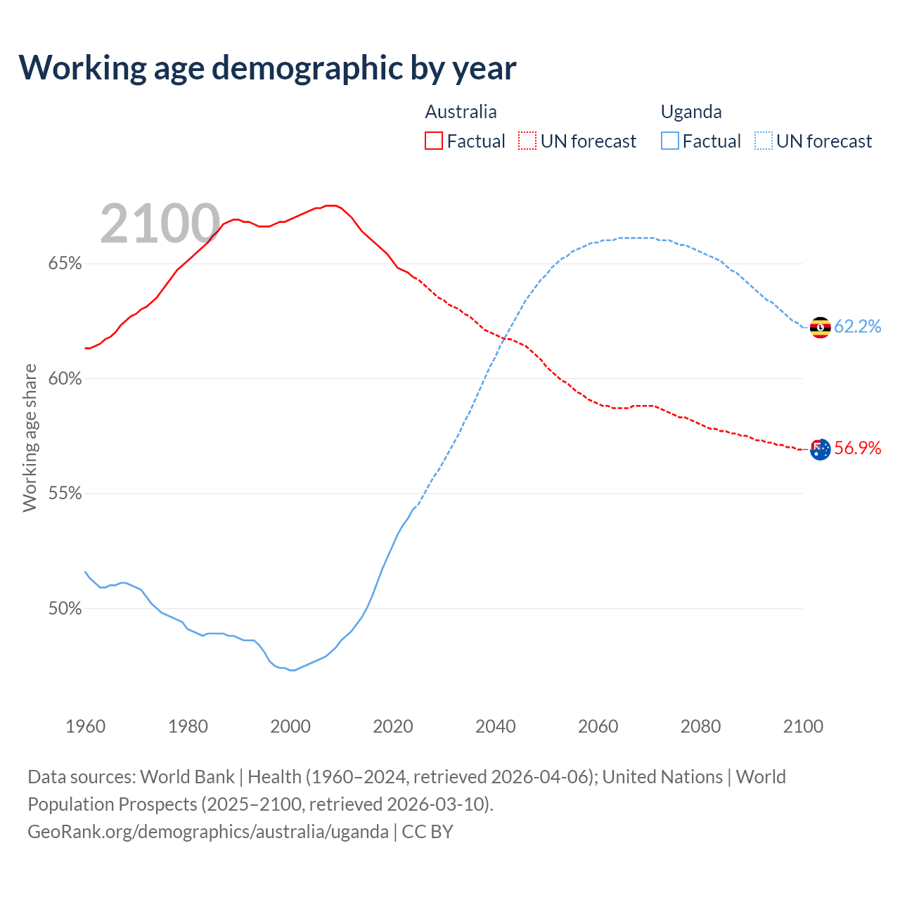 - Australia has 17.9M working age adults (aged 15-64) vs 28.9M in Uganda.