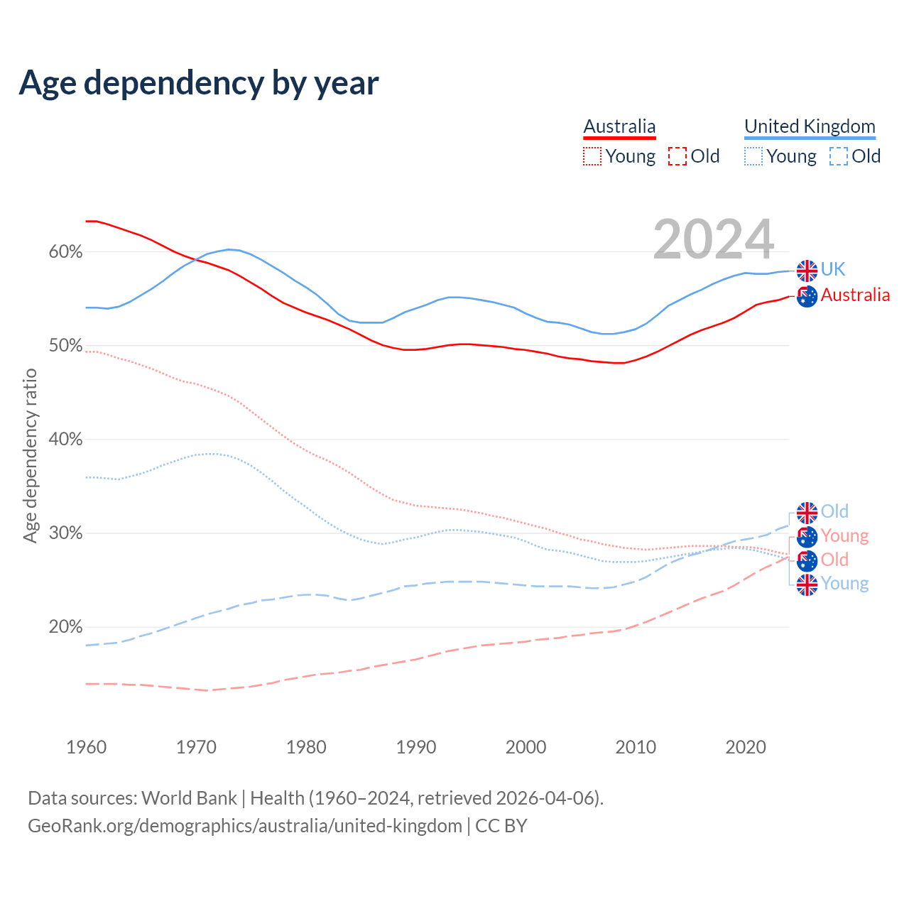 Data sources: World Bank | Health (1960–2024, retrieved 2026-04-06); U.S. Census Bureau (1960–2024, retrieved 2026-02-08).