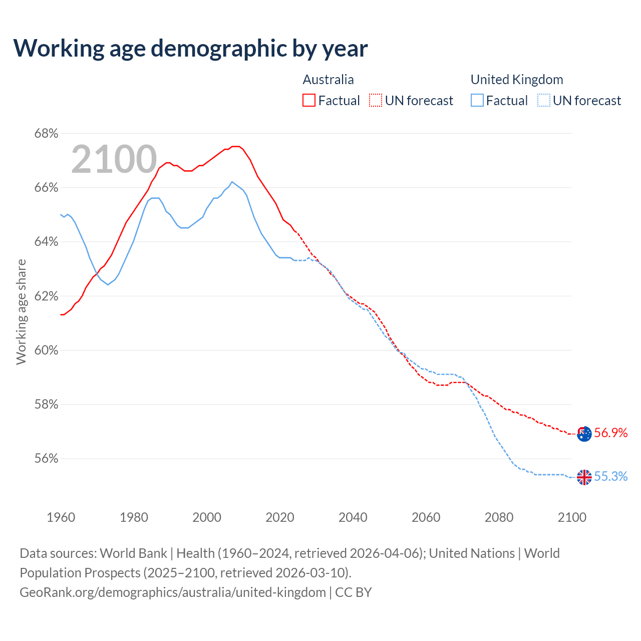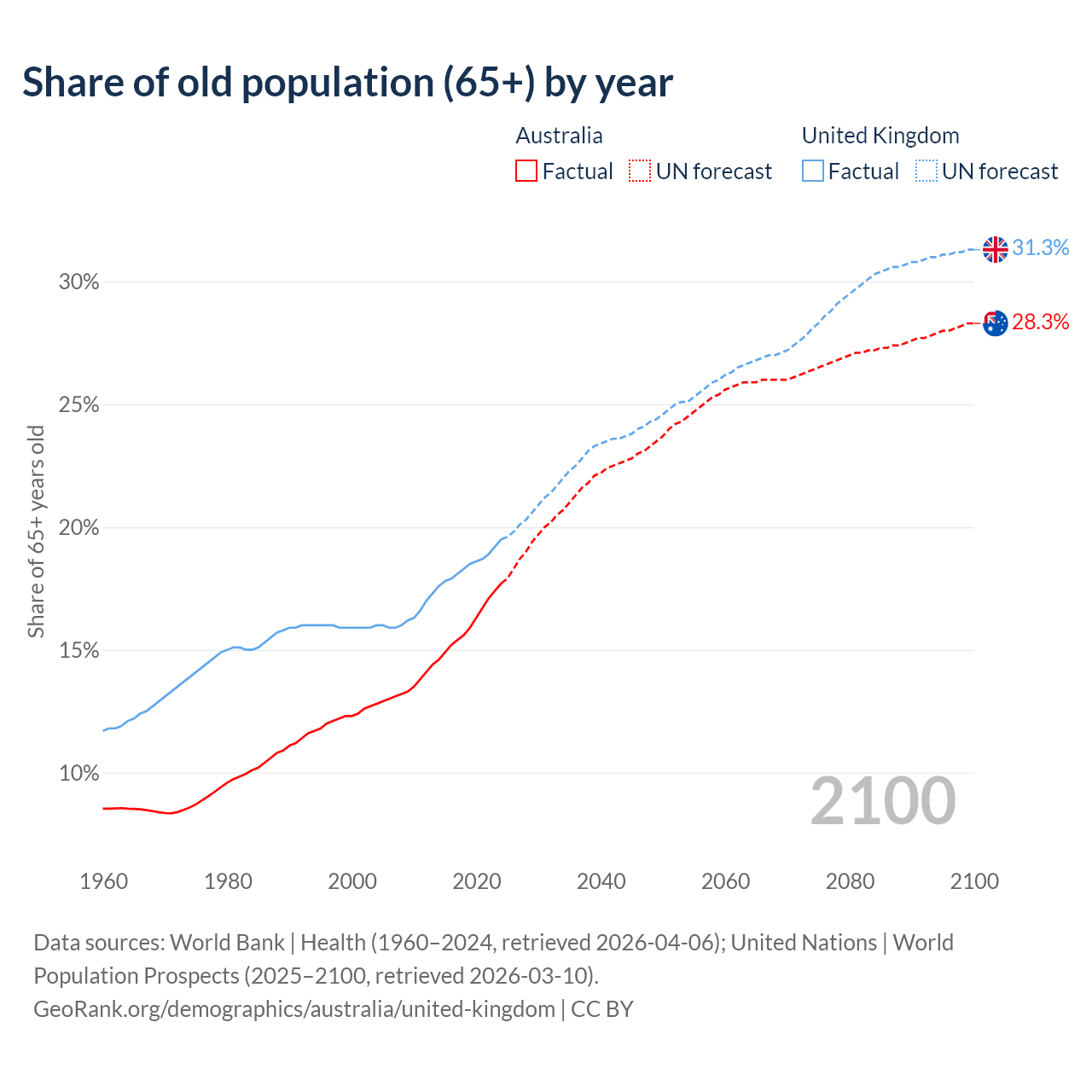 Median age Australia vs United Kingdom, 1960-2100
