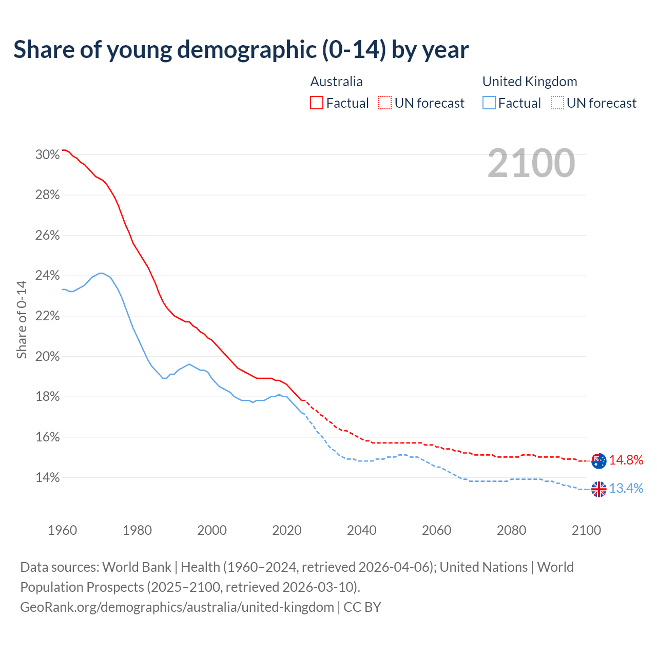 - The share of young demographic (0-15 years old) in Australia is 17.8% vs 17.2% in the United Kingdom.