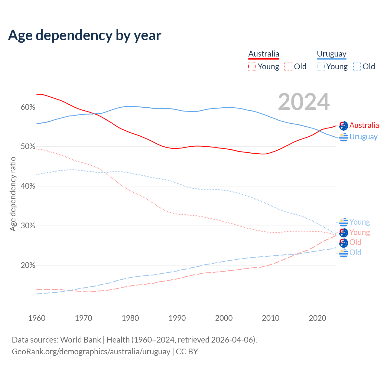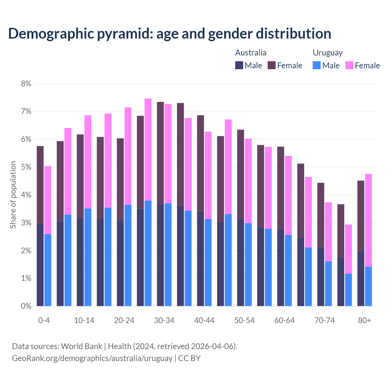 - Australia is ranked 55/196 by median age (oldest to youngest) vs 63/196 for Uruguay.