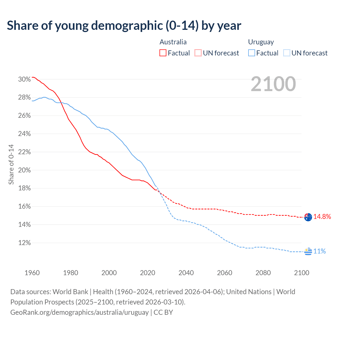 - The share of young demographic (0-15 years old) in Australia is 17.8% vs 18.3% in Uruguay.
