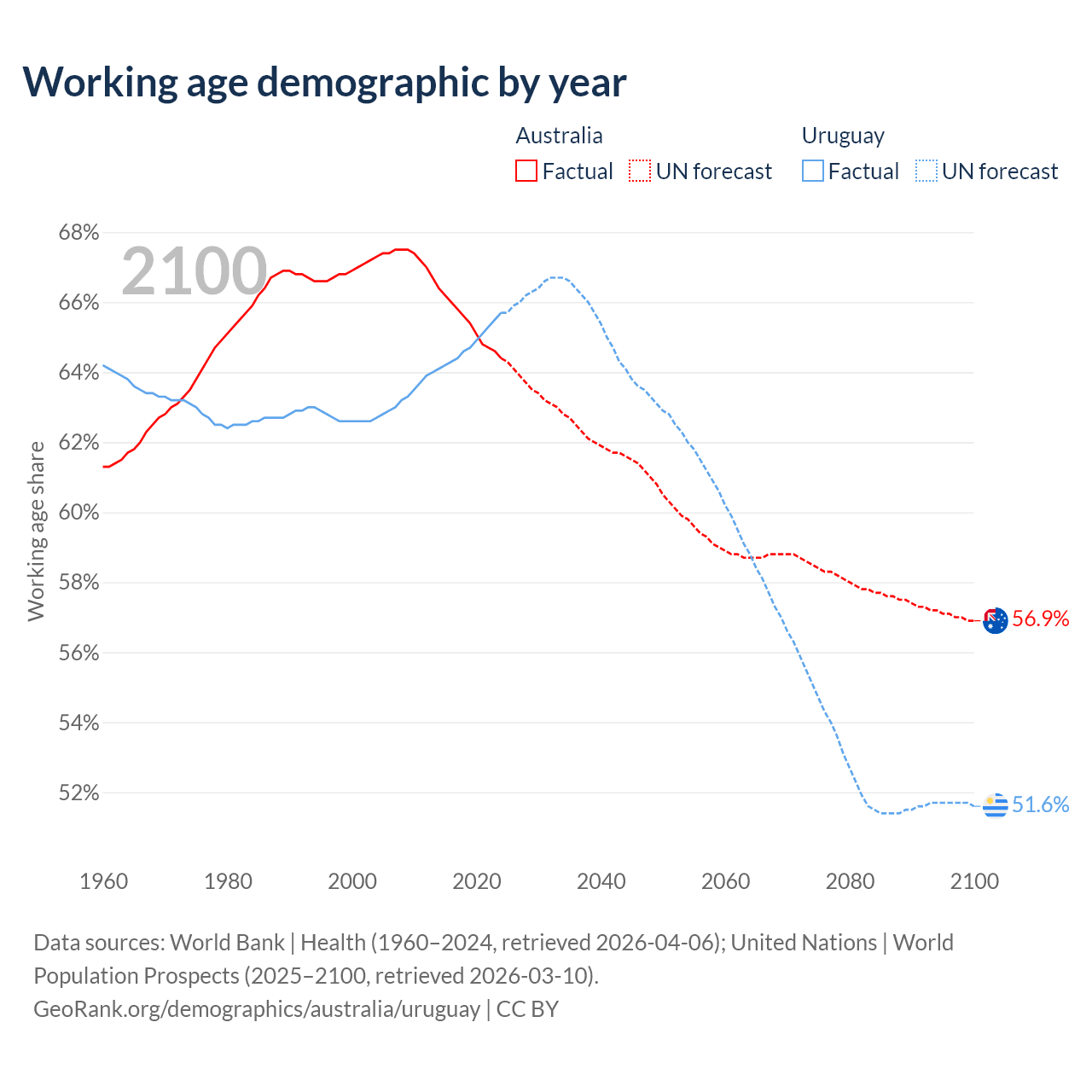 Median age Australia vs Uruguay, 1960-2100