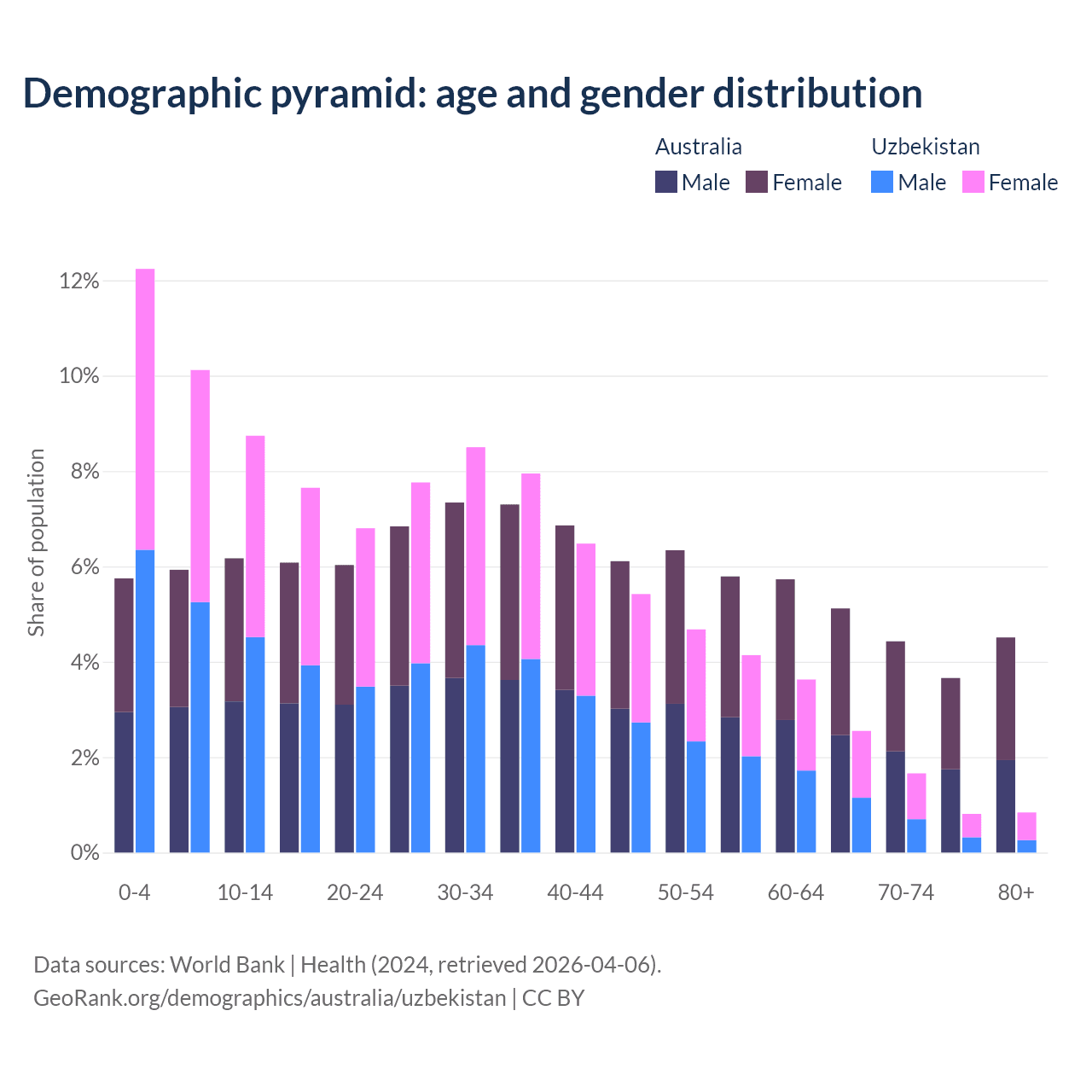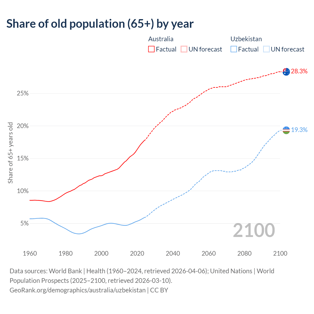 The share of older people aged 65 and over is 17.7% in Australia and 5.86% in Uzbekistan. Life expectancy in Australia compared to Uzbekistan .