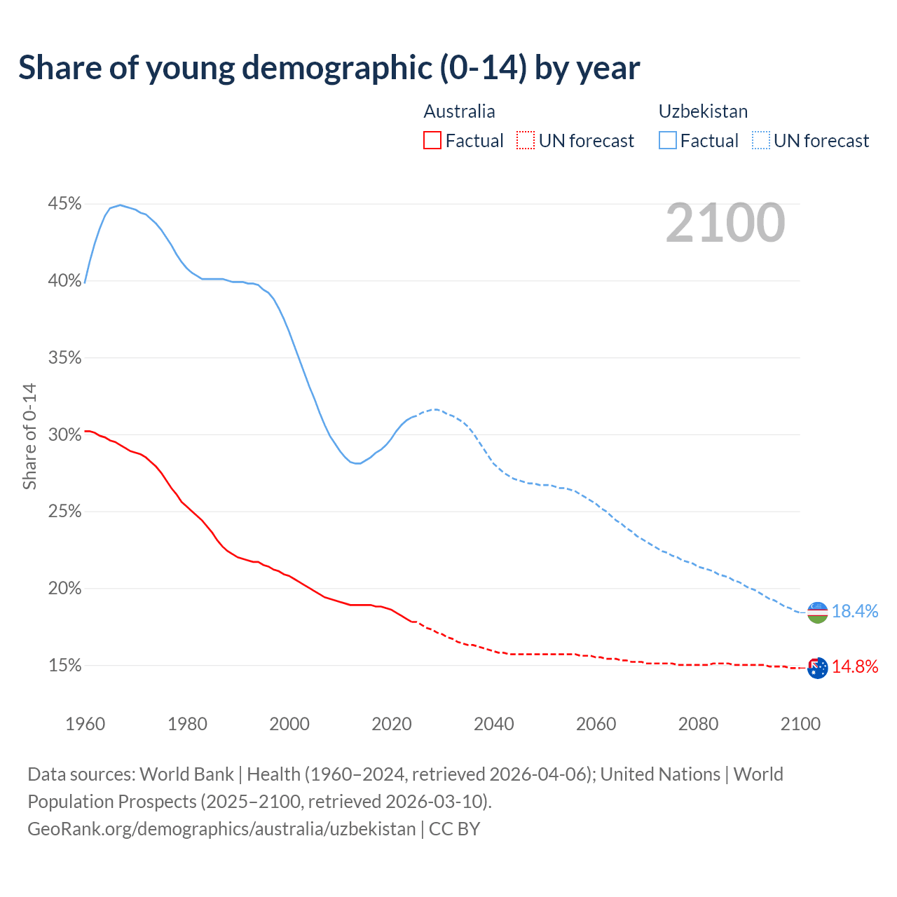 - The share of young demographic (0-15 years old) in Australia is 17.8% vs 31.1% in Uzbekistan.