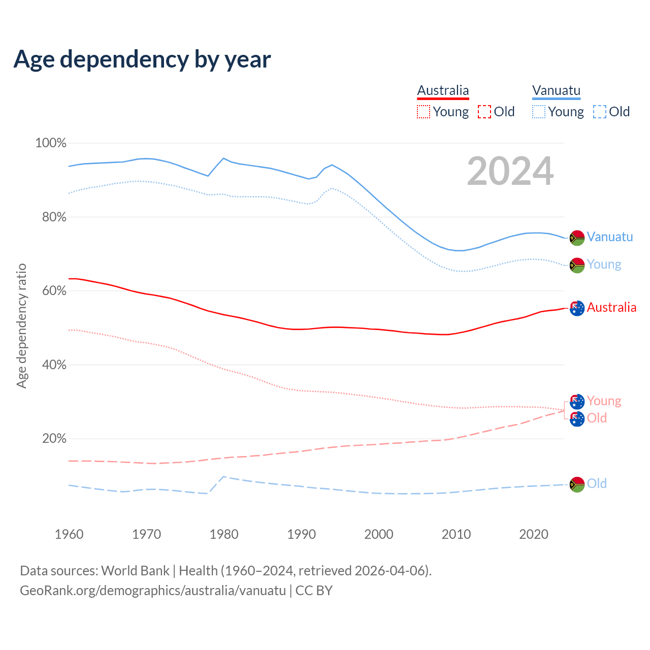 - The share of old-age demographic (65+) in Australia is 17.7% vs 4.3% in Vanuatu.