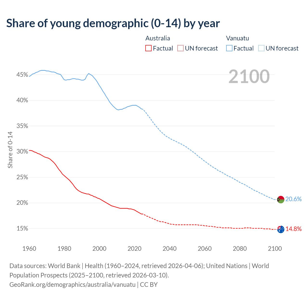 - The share of young demographic (0-15 years old) in Australia is 17.8% vs 38.3% in Vanuatu.