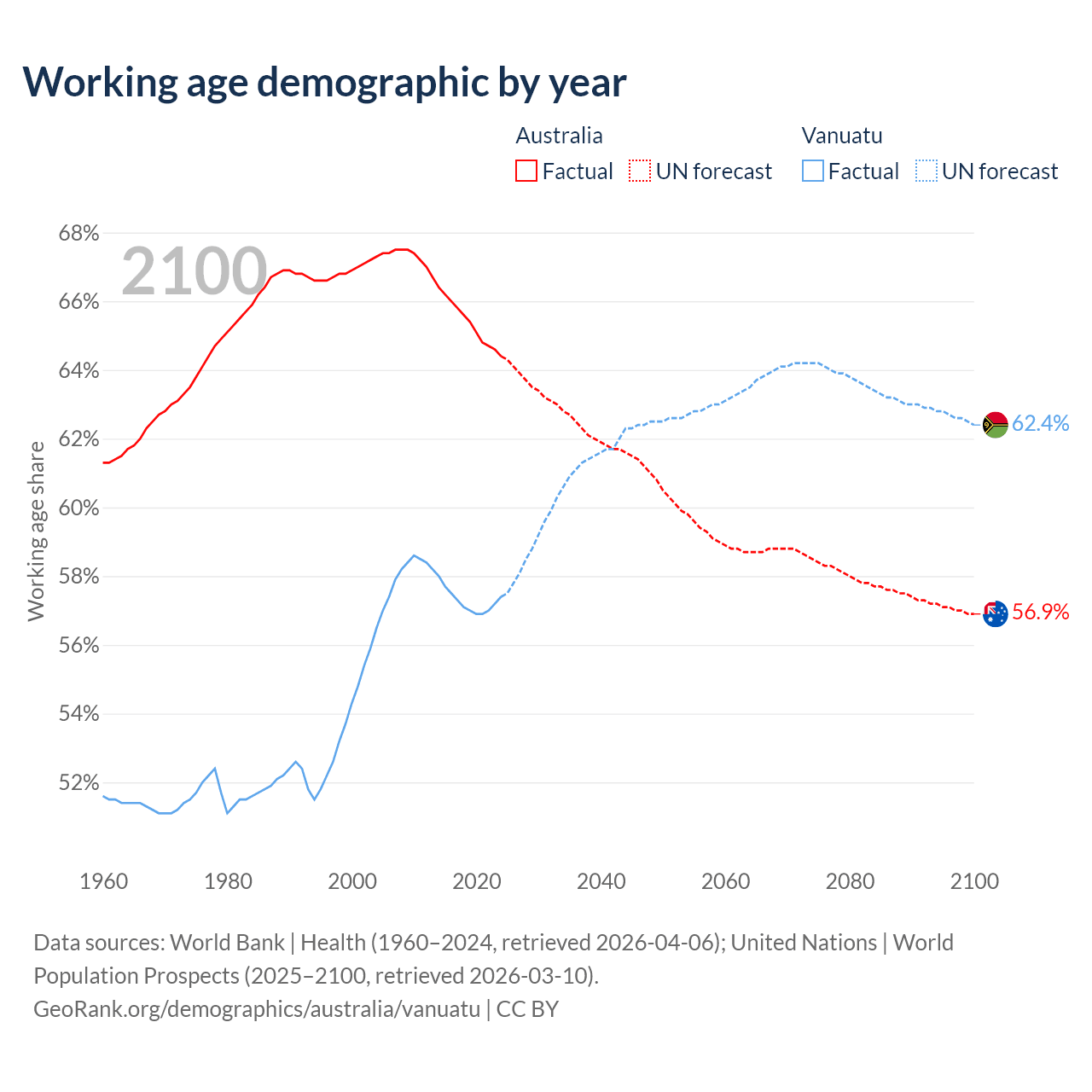 Median age Australia vs Vanuatu, 1960-2100