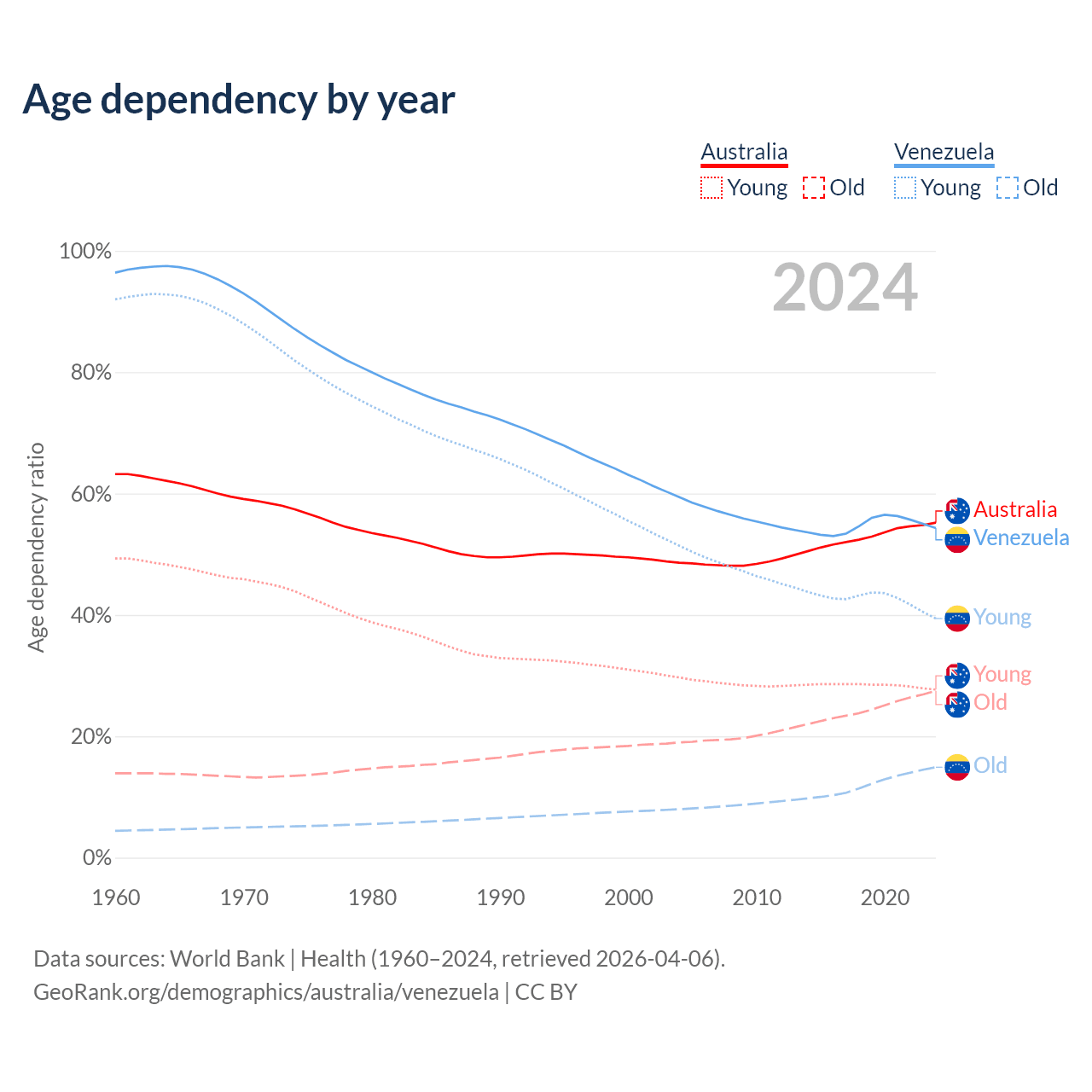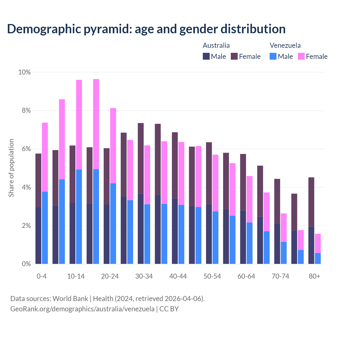 - Australia is ranked 55/196 by median age (oldest to youngest) vs 104/196 for Venezuela.