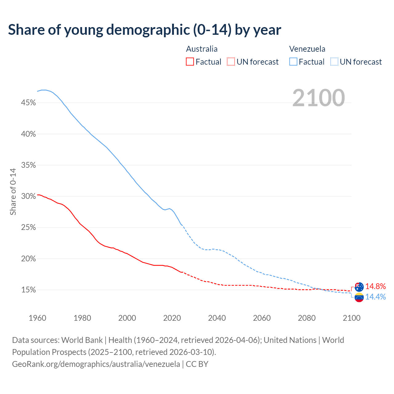 - The share of young demographic (0-15 years old) in Australia is 17.8% vs 25.5% in Venezuela.