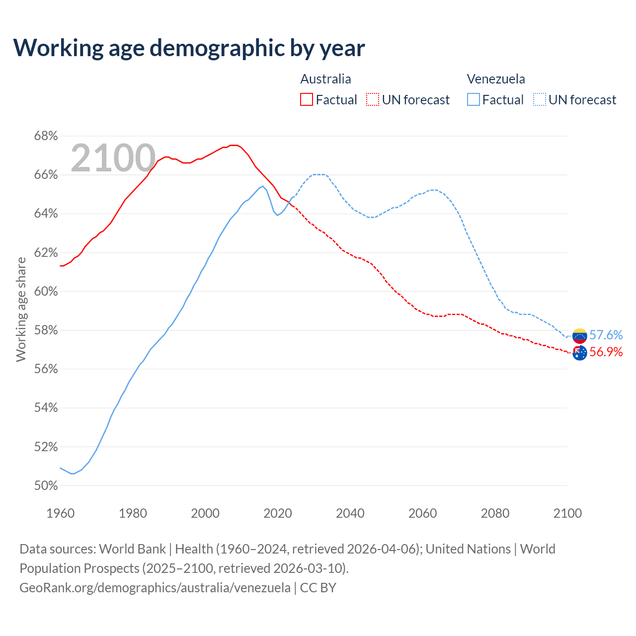 - Australia has 17.9M working age adults (aged 15-64) vs 18.6M in Venezuela.
