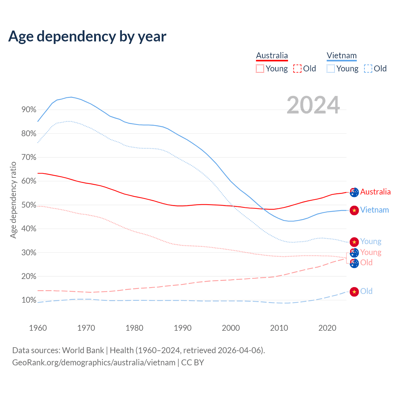 - Australia is ranked 55/196 by median age (oldest to youngest) vs 84/196 for Vietnam.