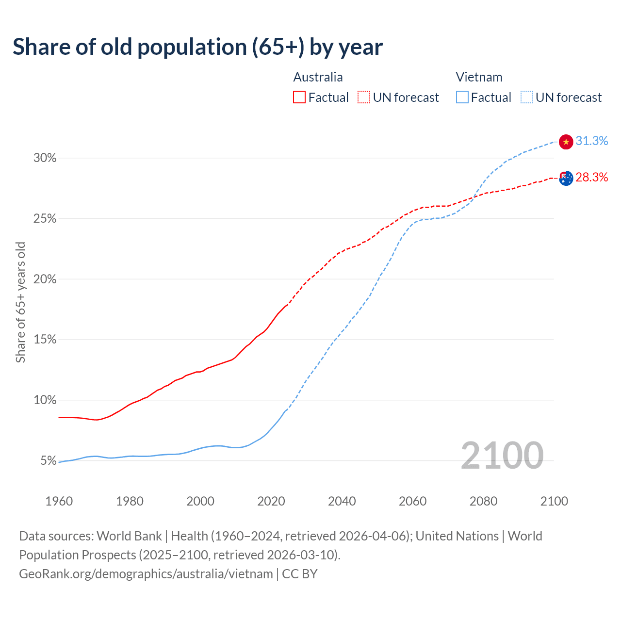 The share of older people aged 65 and over is 17.7% in Australia and 9.05% in Vietnam. Life expectancy in Australia compared to Vietnam .