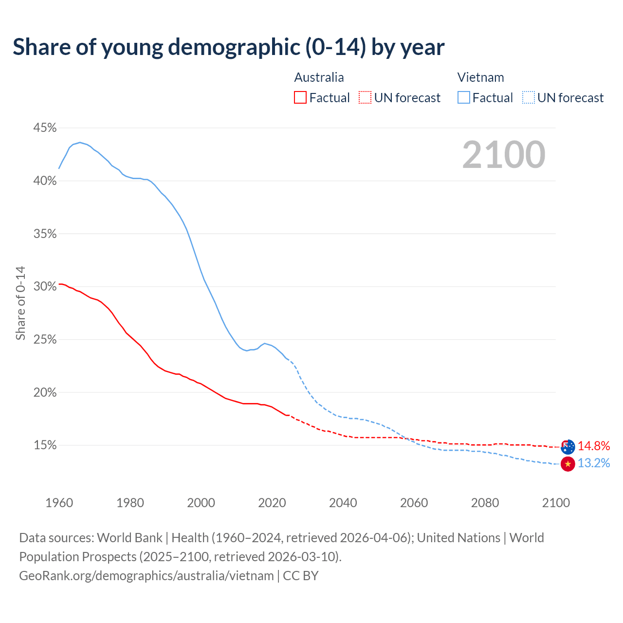 - The share of young demographic (0-15 years old) in Australia is 17.8% vs 23.2% in Vietnam.