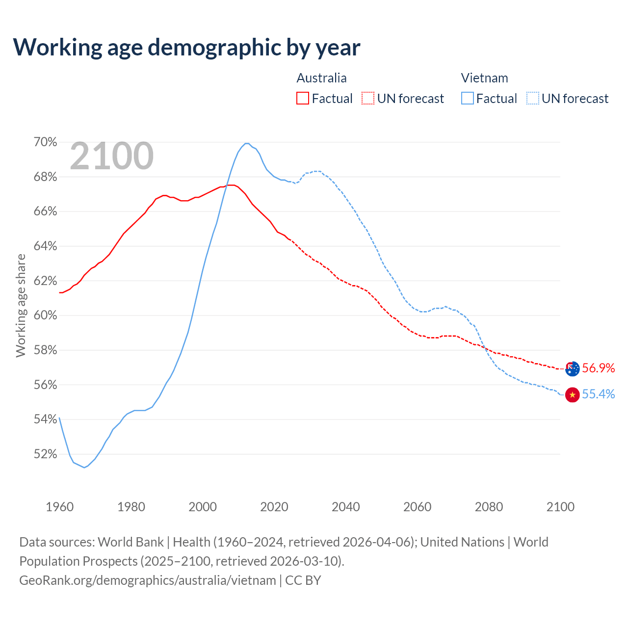 - Australia has 17.9M working age adults (aged 15-64) vs 69.3M in Vietnam.