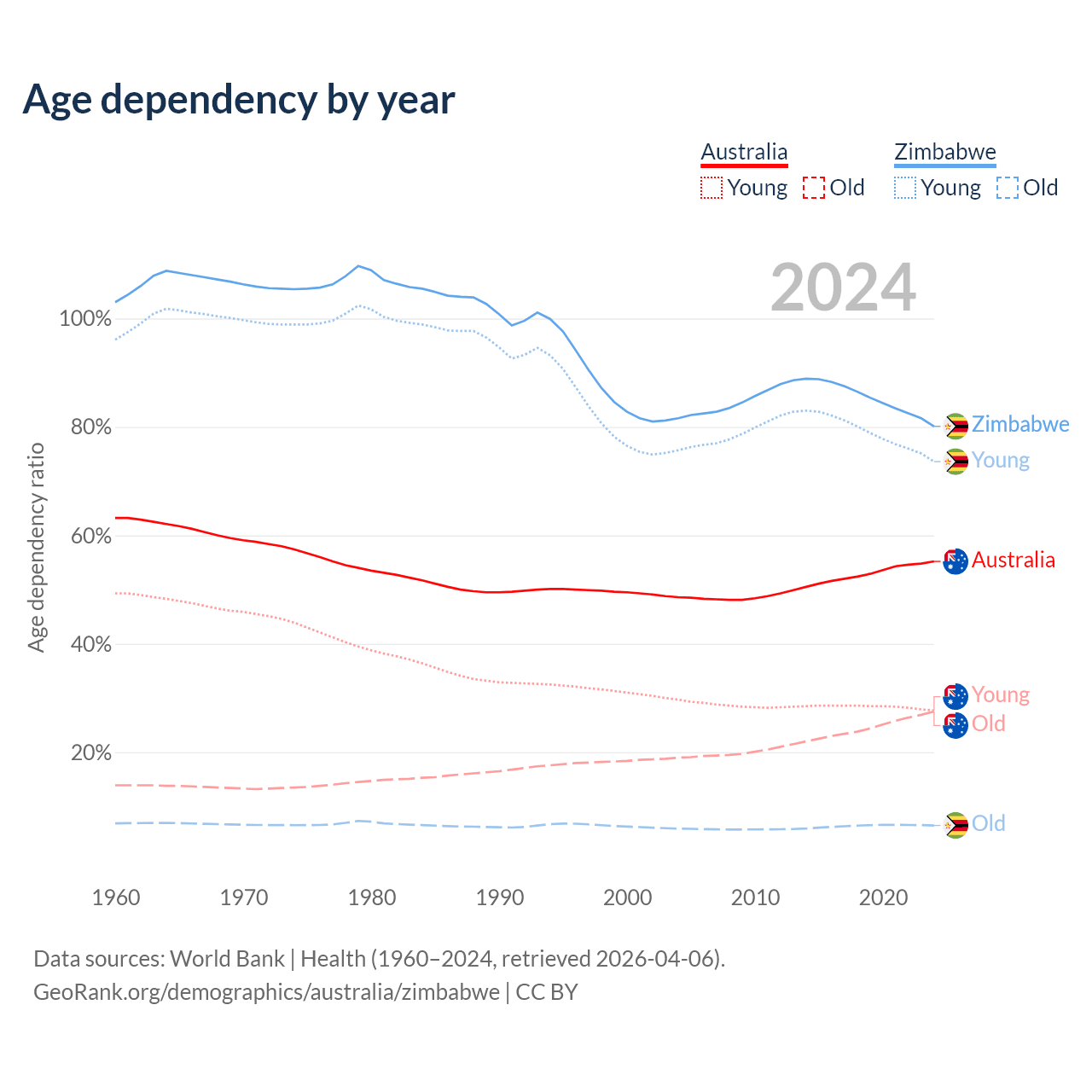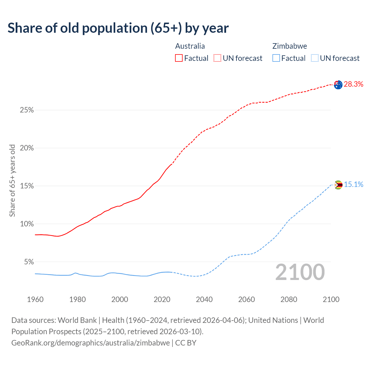 The share of older people aged 65 and over is 17.7% in Australia and 3.6% in Zimbabwe. Life expectancy in Australia compared to Zimbabwe .
