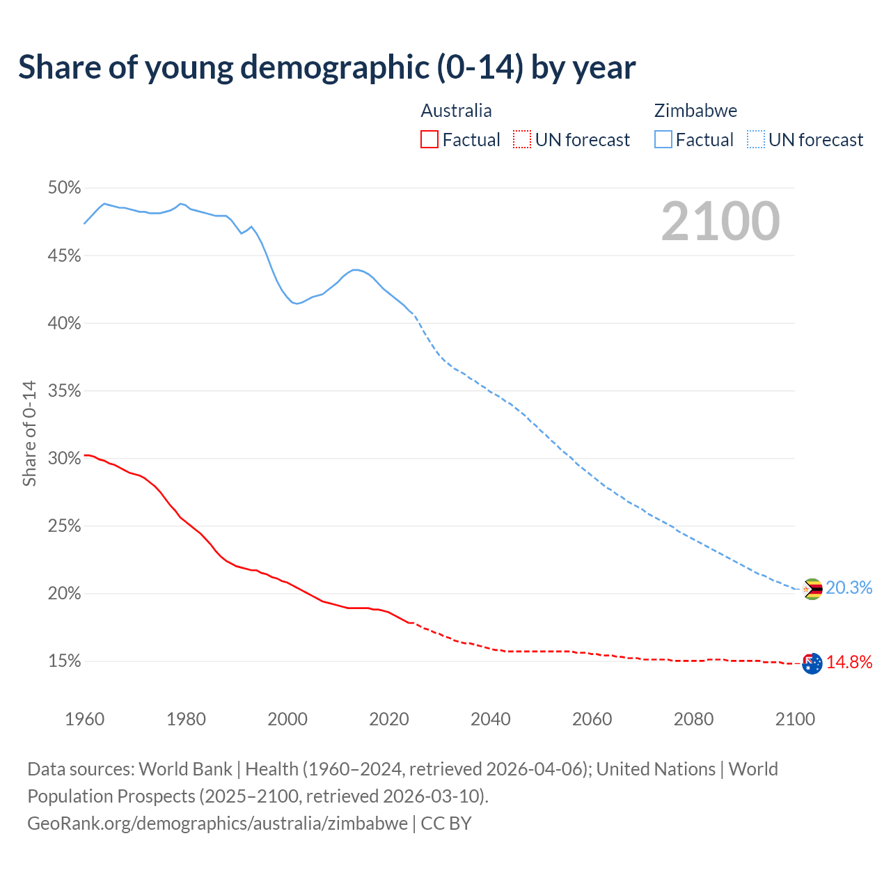 - The share of young demographic (0-15 years old) in Australia is 17.8% vs 40.9% in Zimbabwe.
