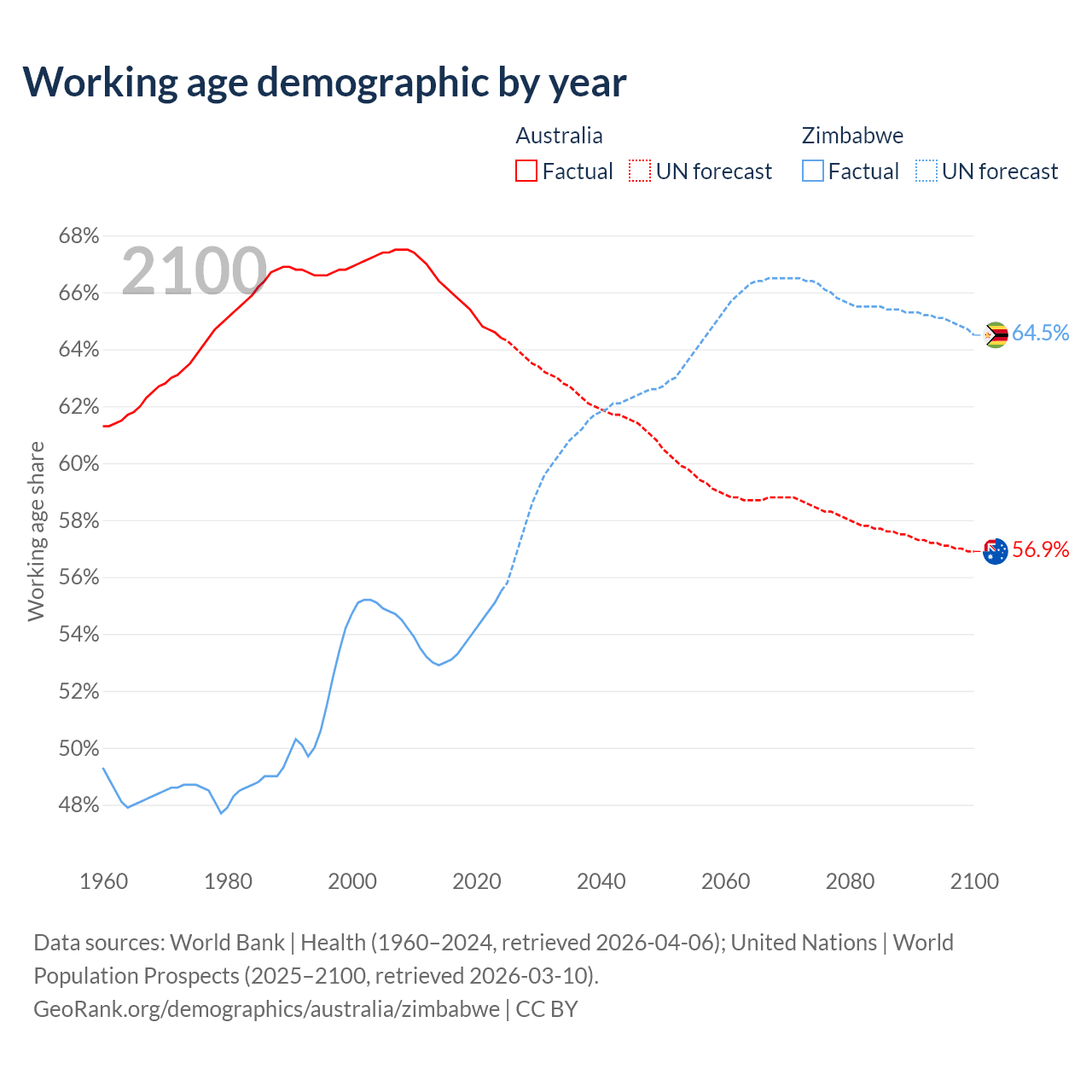 - Australia has 17.9M working age adults (aged 15-64) vs 9.64M in Zimbabwe.
