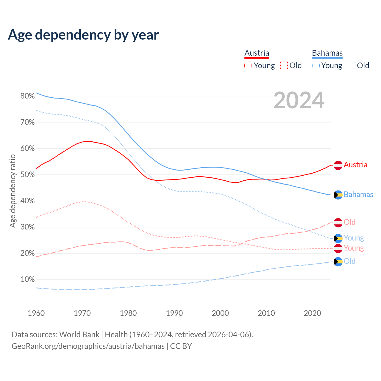 Data sources: World Bank | Health (1960–2024, retrieved 2026-04-06); U.S. Census Bureau (1960–2024, retrieved 2026-02-08).