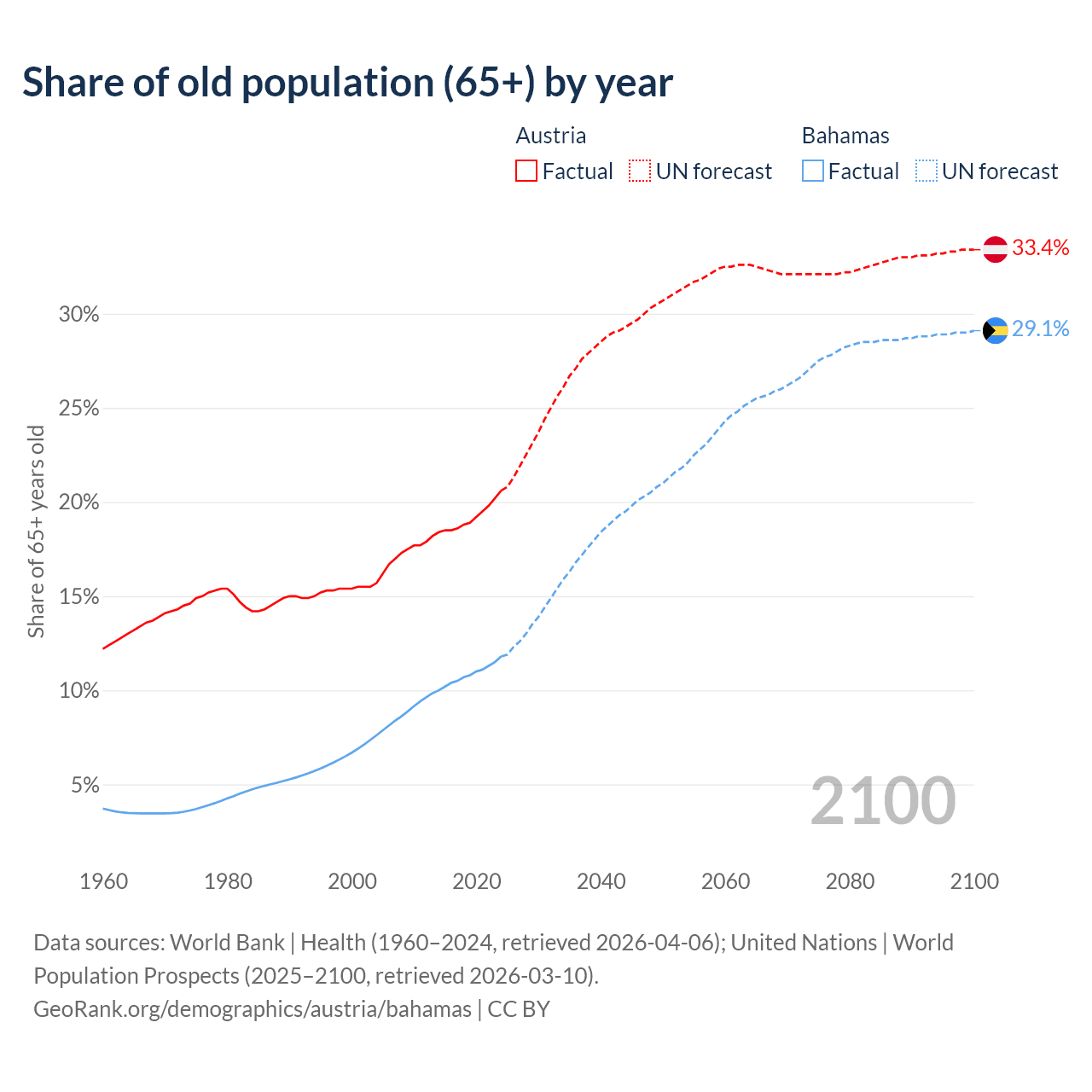 The share of older people aged 65 and over is 20.6% in Austria and 11.8% in the Bahamas. Life expectancy in Austria compared to the Bahamas .
