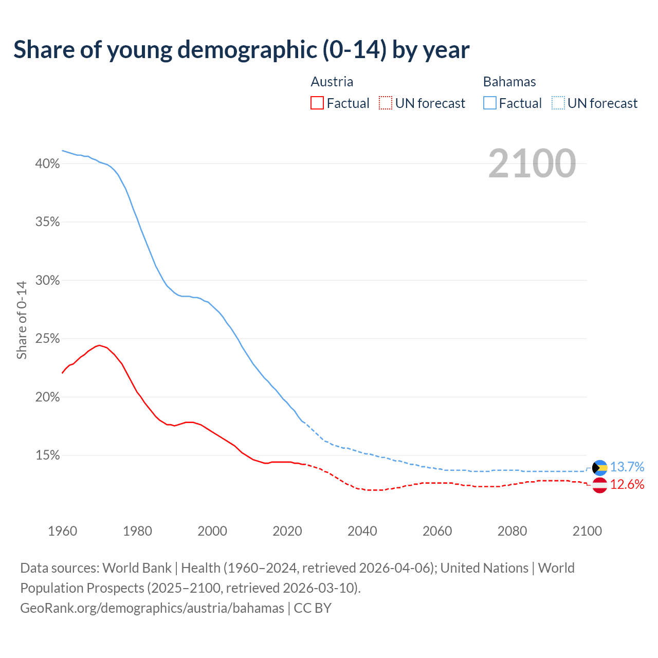 - The share of young demographic (0-15 years old) in Austria is 14.2% vs 17.9% in the Bahamas.