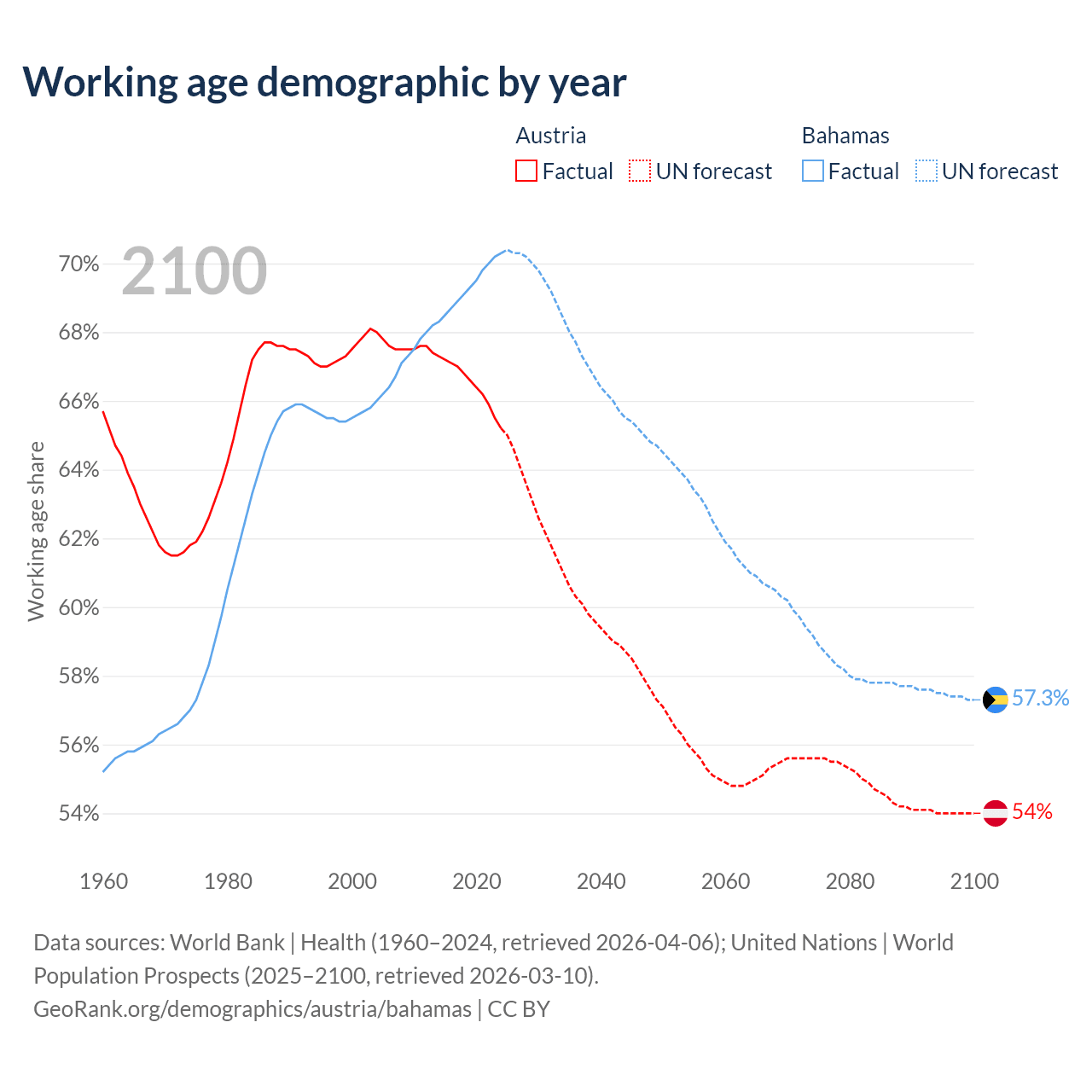 Median age Austria vs Bahamas, 1960-2100