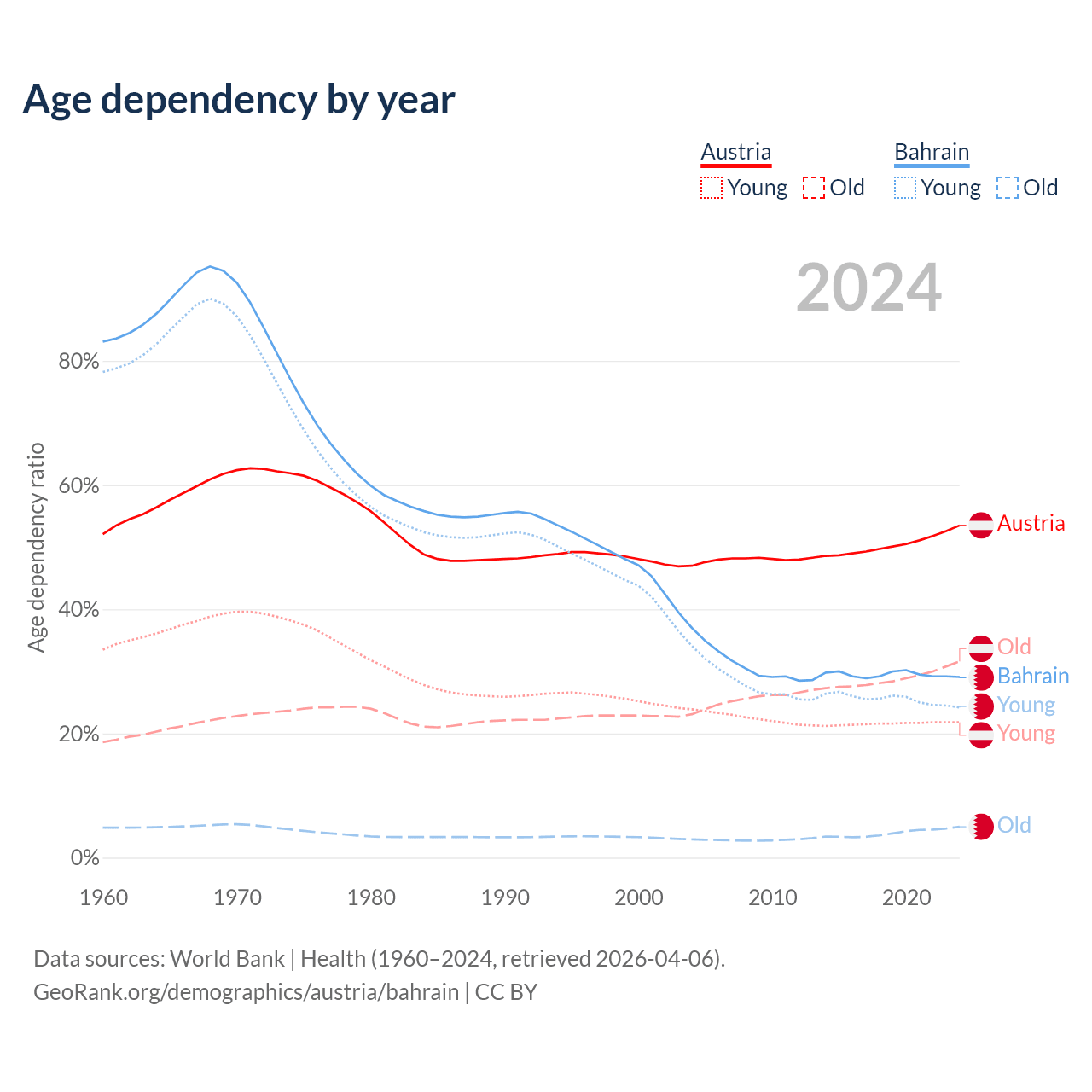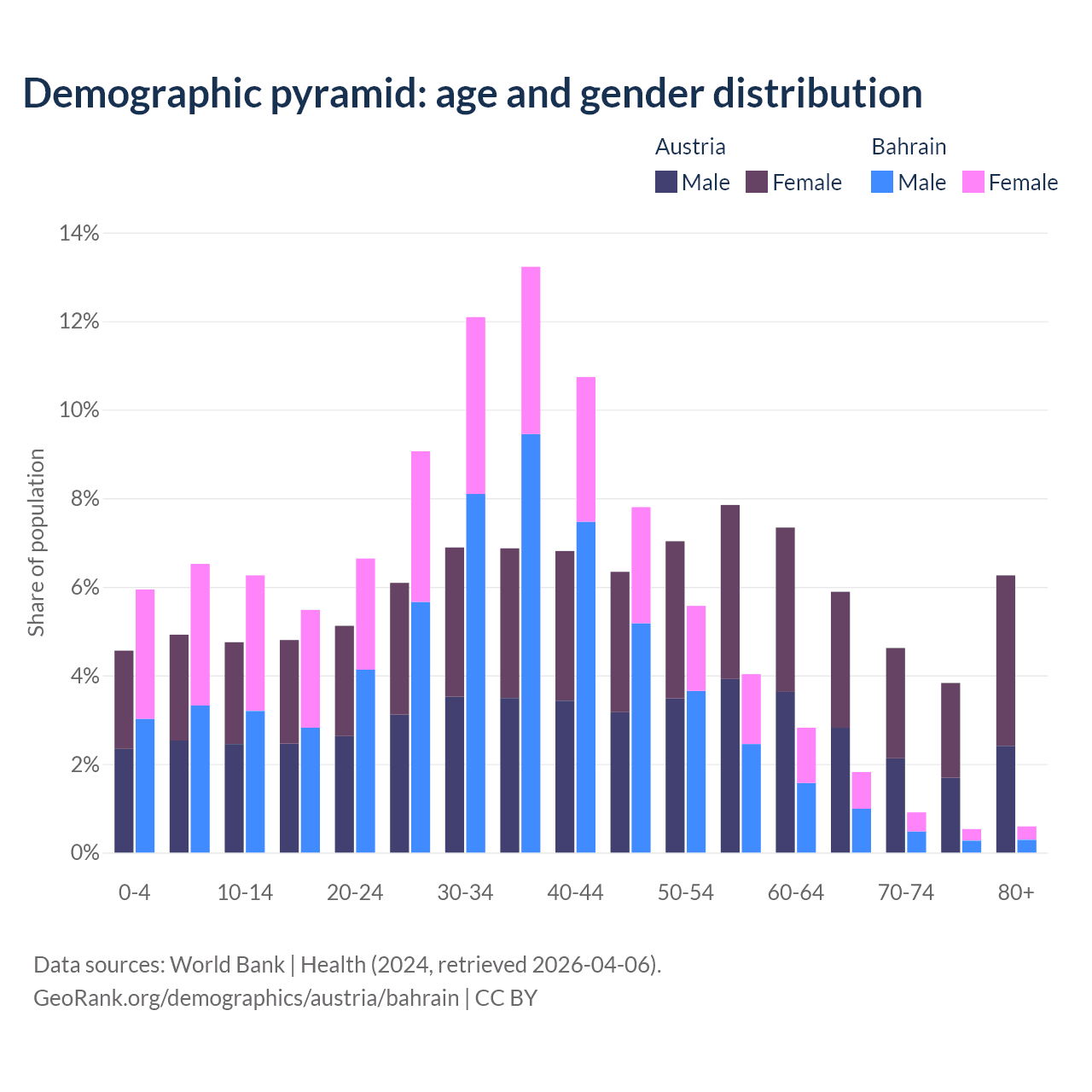 - Austria is ranked 19/196 by median age (oldest to youngest) vs 80/196 for Bahrain.
