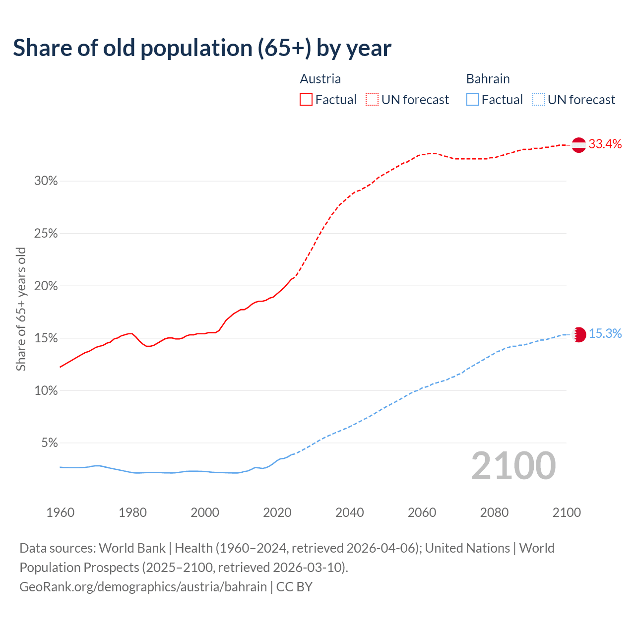 The share of older people aged 65 and over is 20.6% in Austria and 3.85% in Bahrain. Life expectancy in Austria compared to Bahrain .
