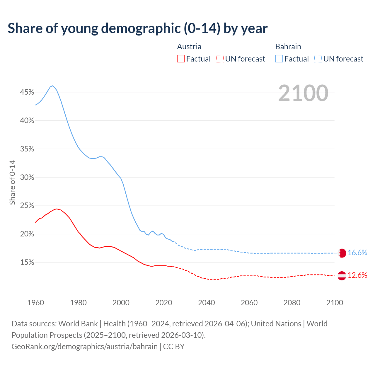- The share of young demographic (0-15 years old) in Austria is 14.2% vs 18.7% in Bahrain.