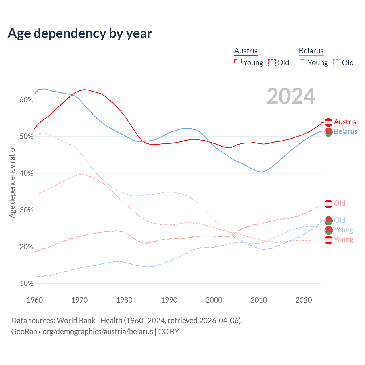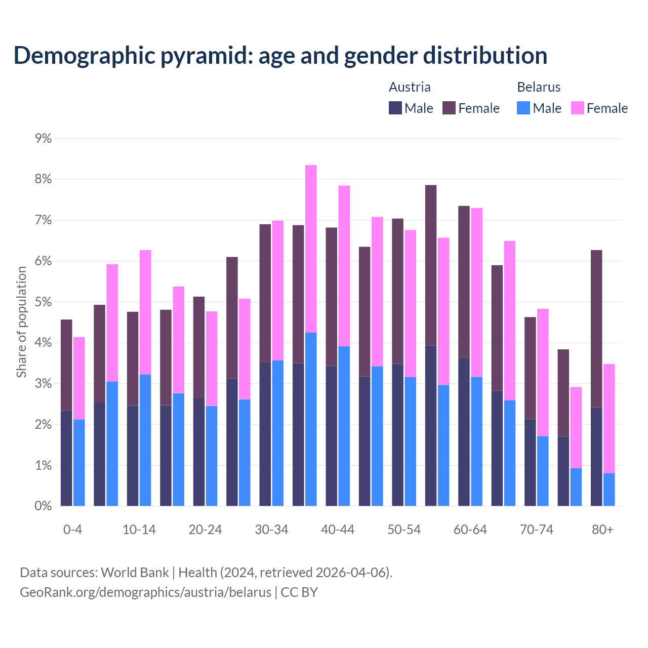 - Austria is ranked 19/196 by median age (oldest to youngest) vs 35/196 for Belarus.