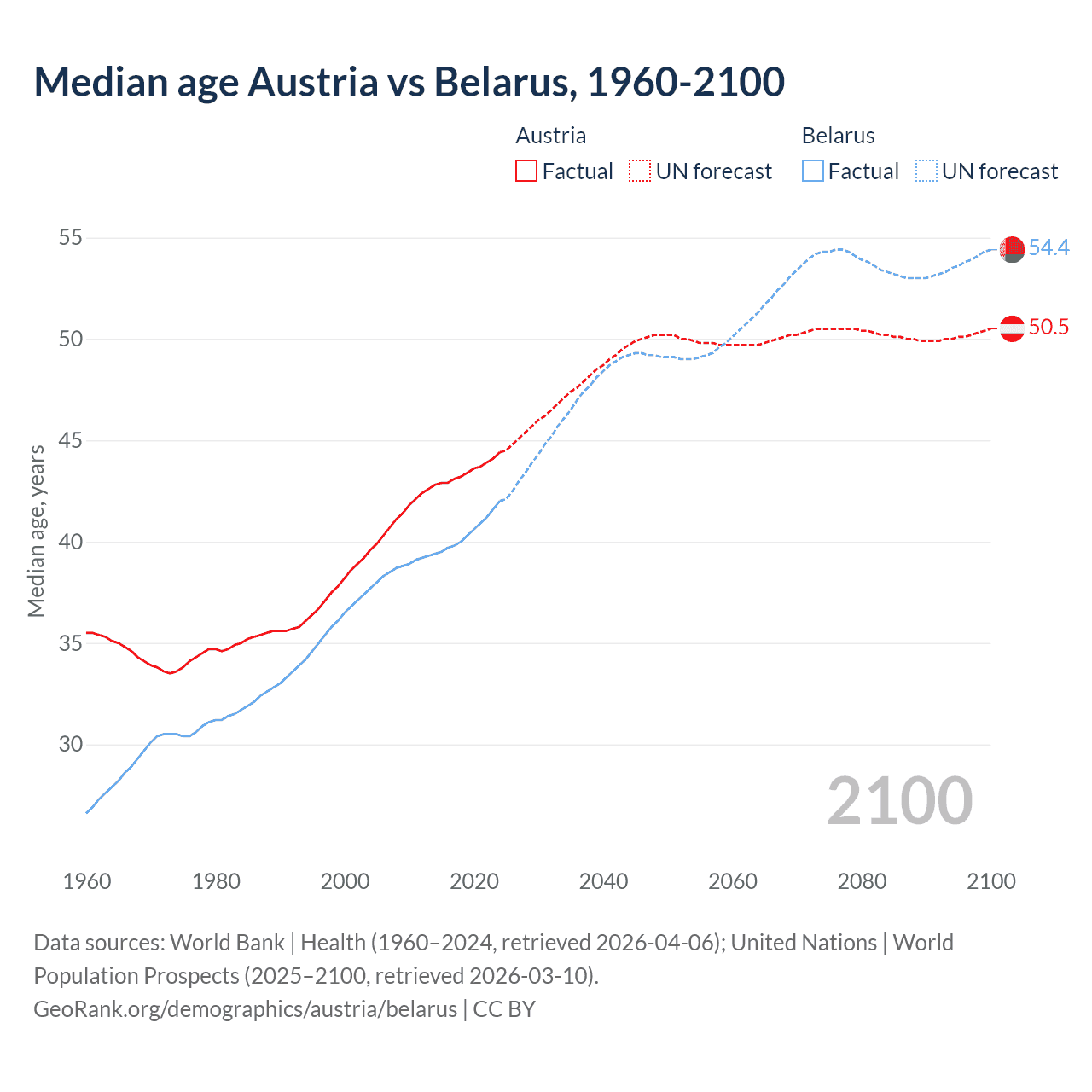 Median age Austria vs Belarus, 1960-2100