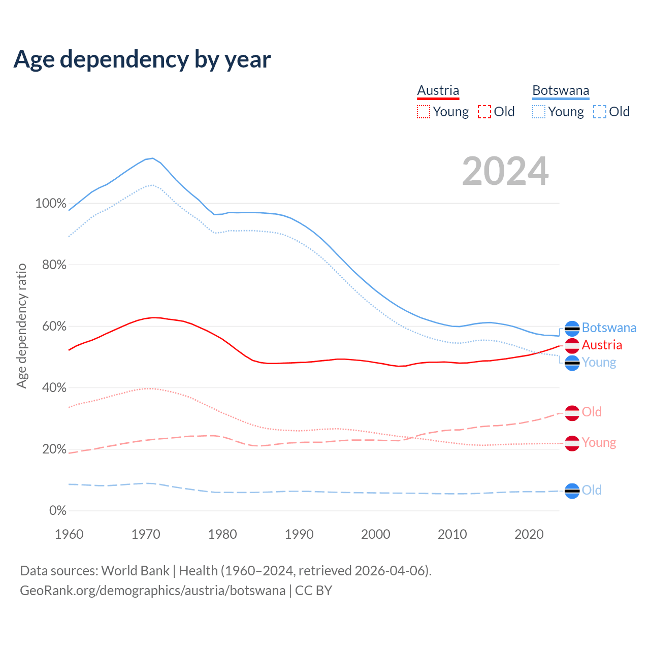 - The share of old-age demographic (65+) in Austria is 20.6% vs 4.04% in Botswana.