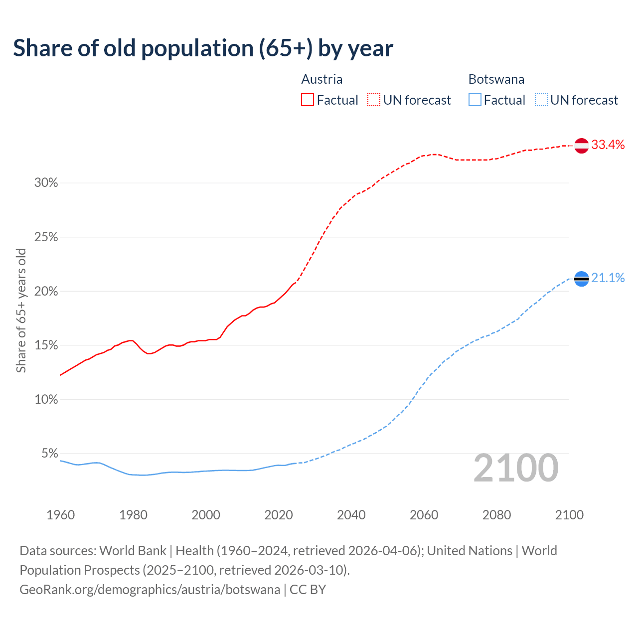 The share of older people aged 65 and over is 20.6% in Austria and 4.04% in Botswana. Life expectancy in Austria compared to Botswana .
