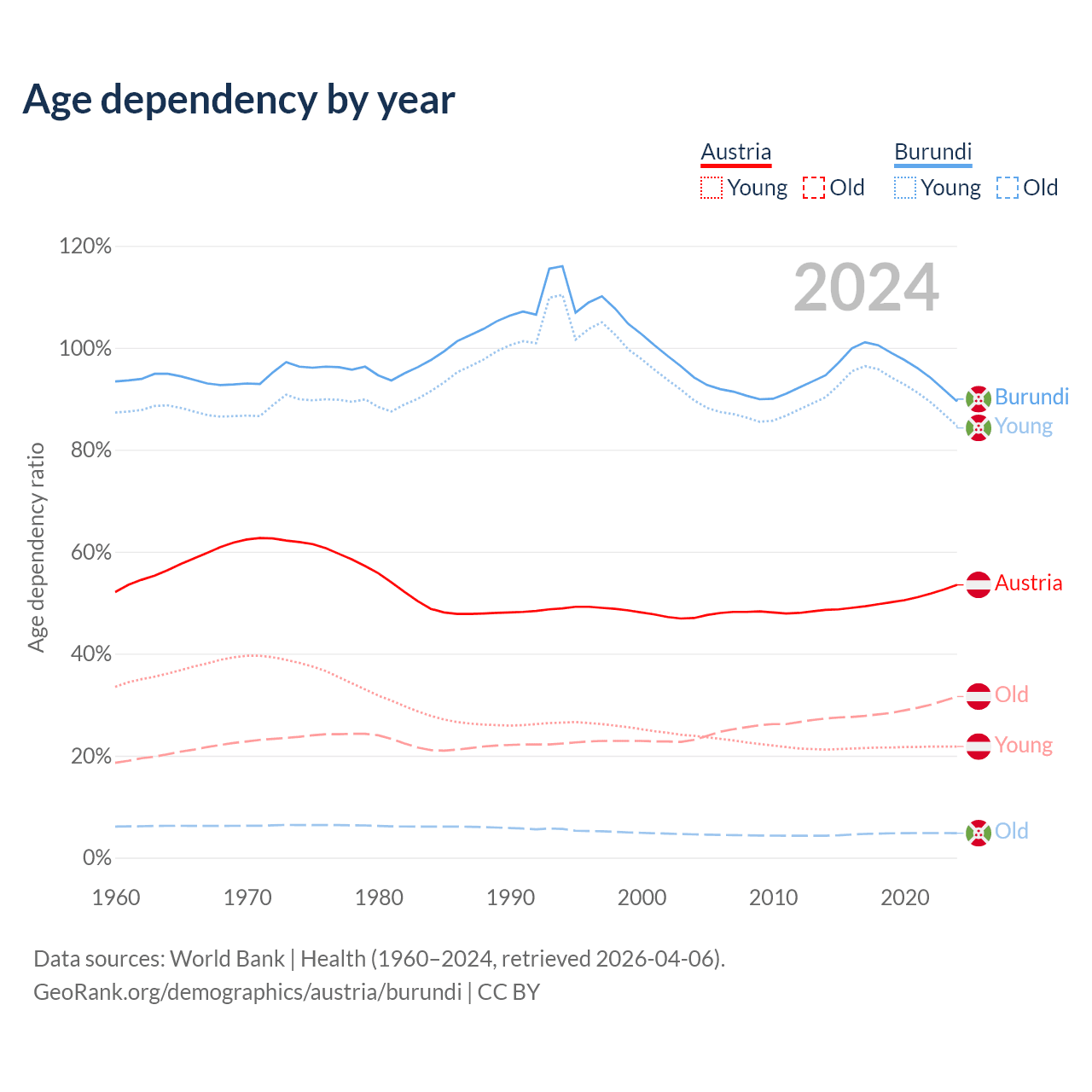 - Austria is ranked 19/196 by median age (oldest to youngest) vs 190/196 for Burundi.