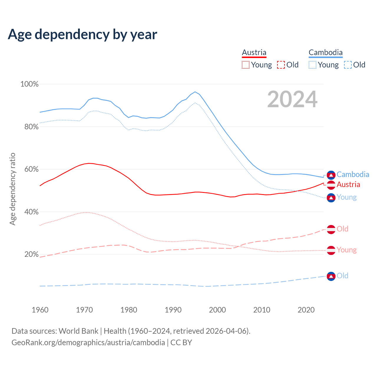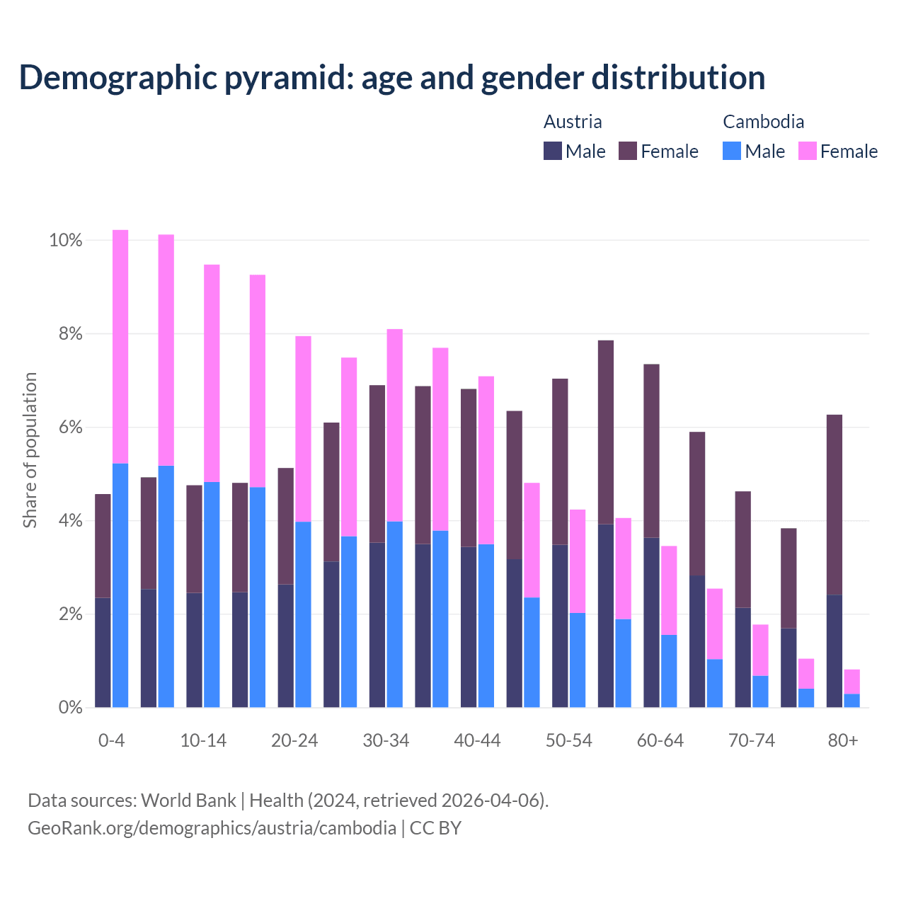 - The share of old-age demographic (65+) in Austria is 20.6% vs 6.16% in Cambodia.