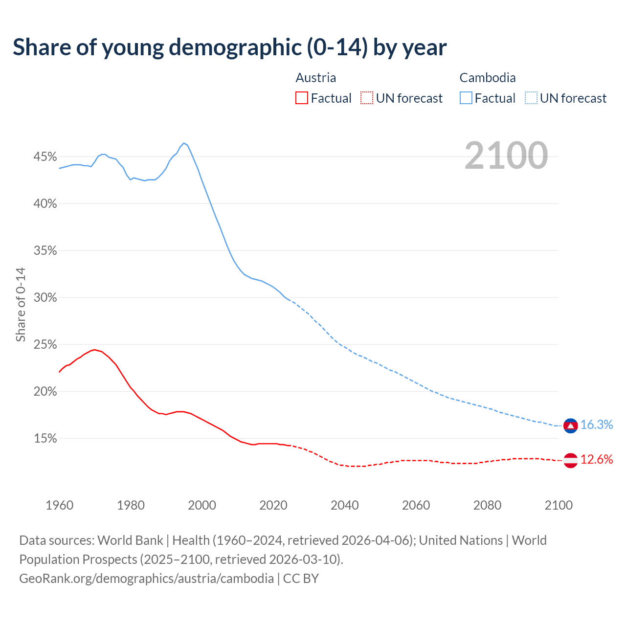 - The share of young demographic (0-15 years old) in Austria is 14.2% vs 29.8% in Cambodia.