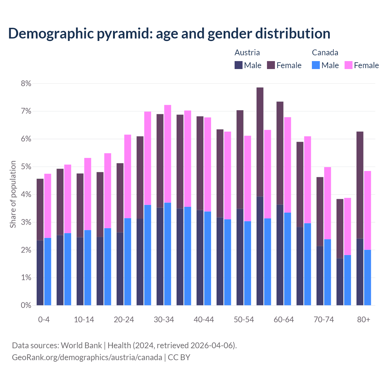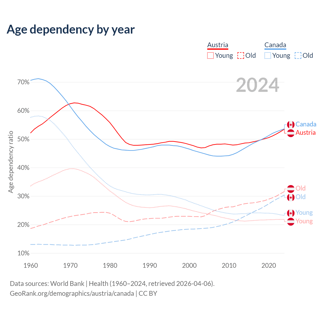 - Austria is ranked 19/196 by median age (oldest to youngest) vs 38/196 for Canada.