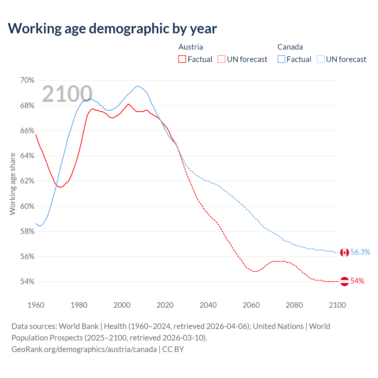 Median age Austria vs Canada, 1960-2100