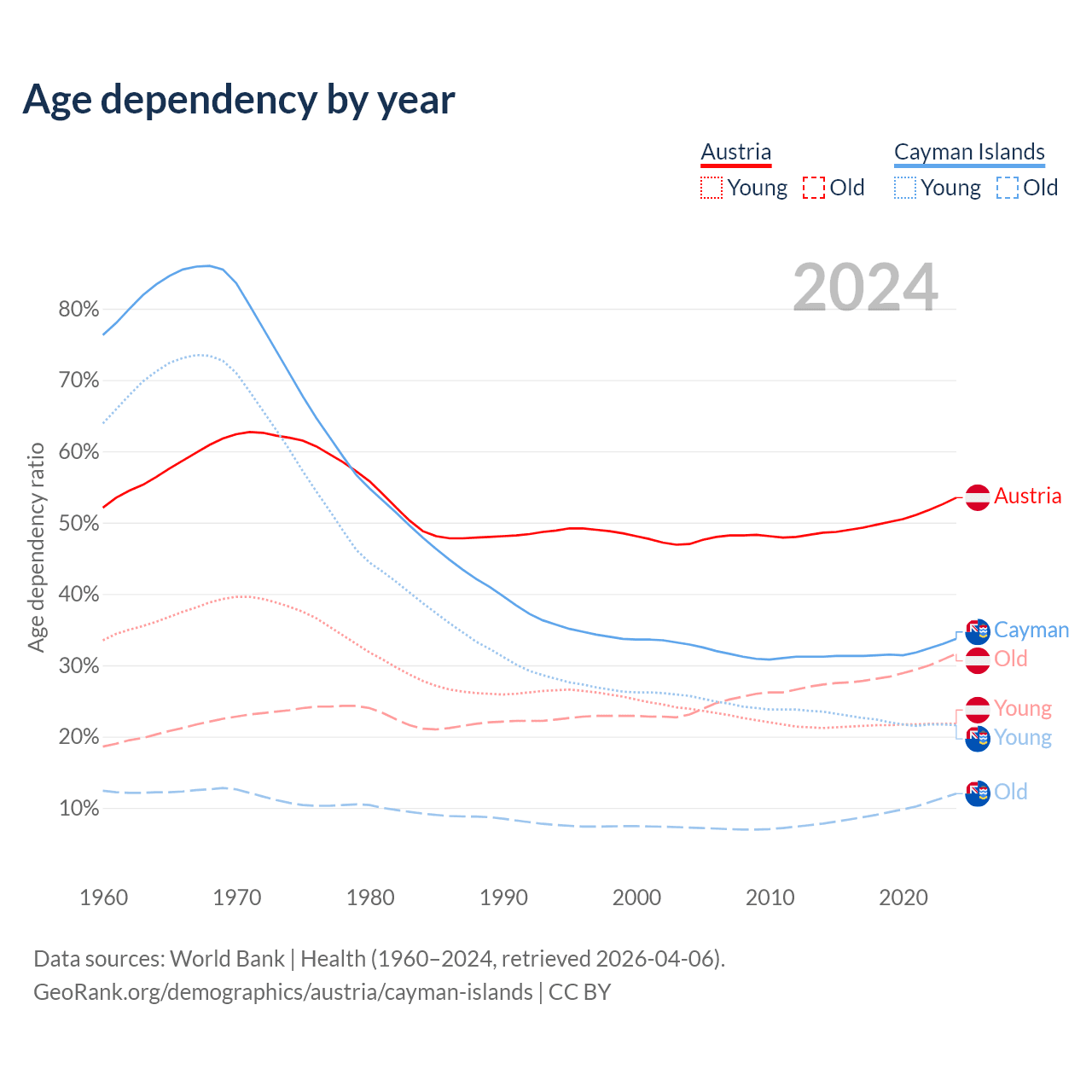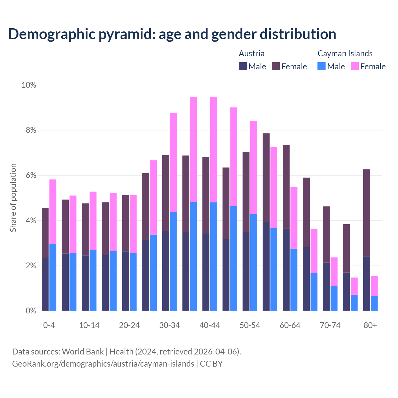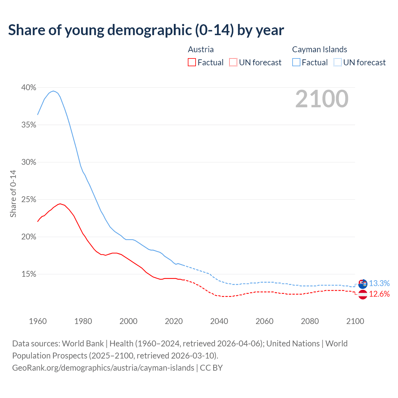 - The share of young demographic (0-15 years old) in Austria is 14.2% vs 16.2% in the Cayman Islands.